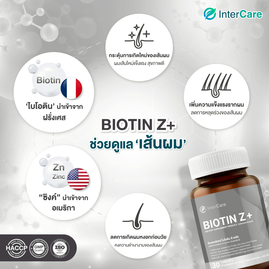 [แพ็คคู่] InterCare Biotin Z+ ไบโอติน บำรุงผม ลดผมร่วง แก้ผมบาง เร่งผมยาว 30 เม็ด 2 กระปุก