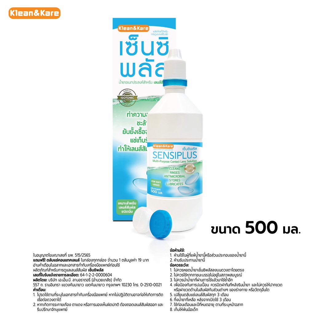 น้ำยาล้างและแช่คอนแทคเลนส์ SensiPlus (ยี่ห้อ Klean&Kare) แถมตลับคอนแทคเลนส์ในกล่องฟรี