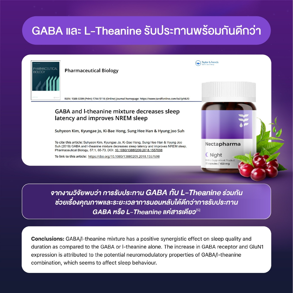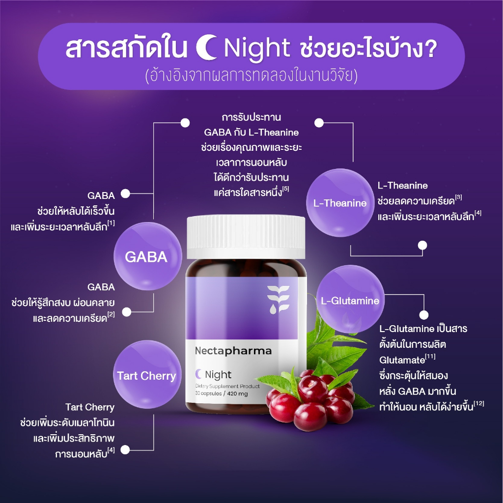 Nectapharma Night อาหารเสริมประกอบด้วย Pharmagaba Tart Cherry L-Theanine และ L-Glutamine