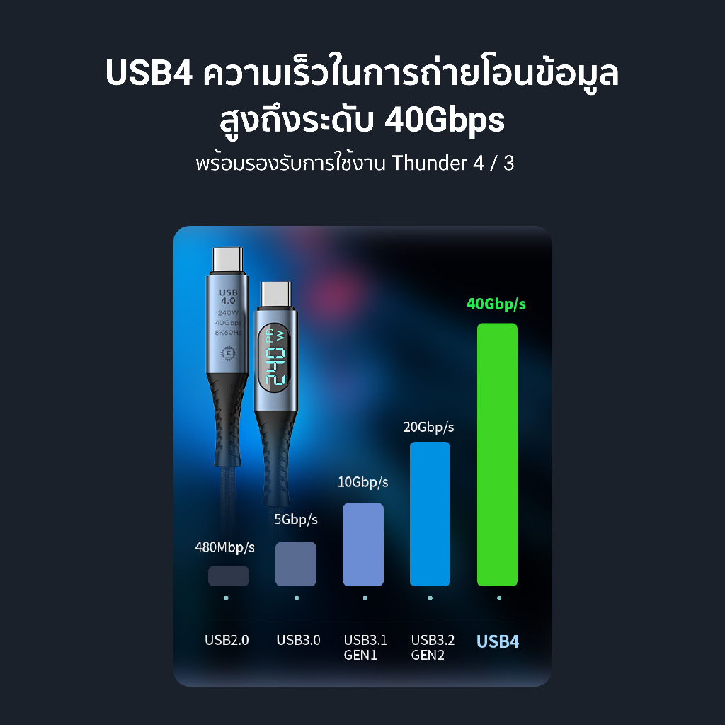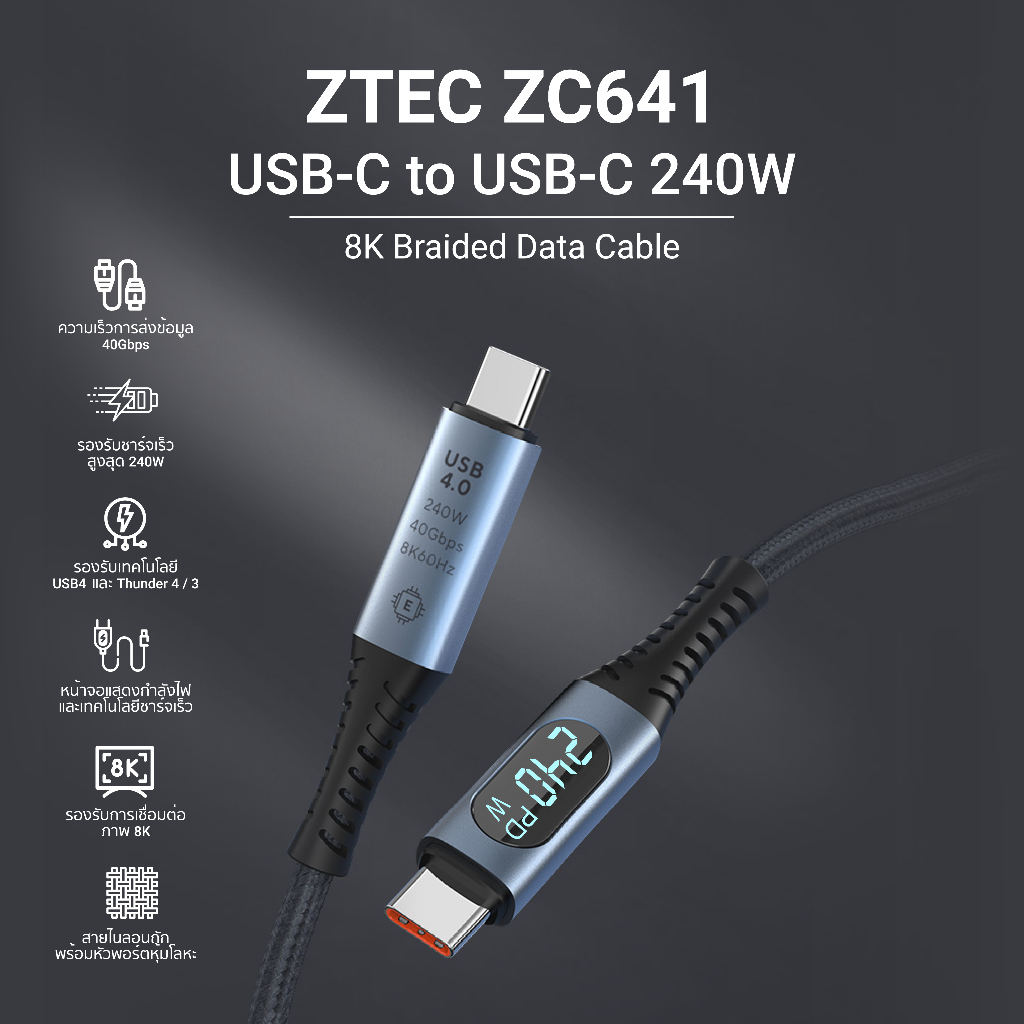 [ลดเหลือ 467] ZTEC ZC641 สายชาร์จ Thunder Bolt USB-C to USB-C วัสดุไนลอนคุณภาพสูง ทนหักทนงอ -24M