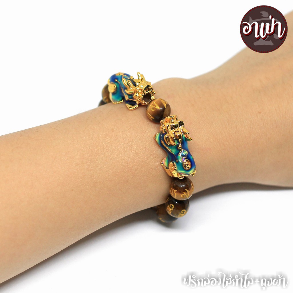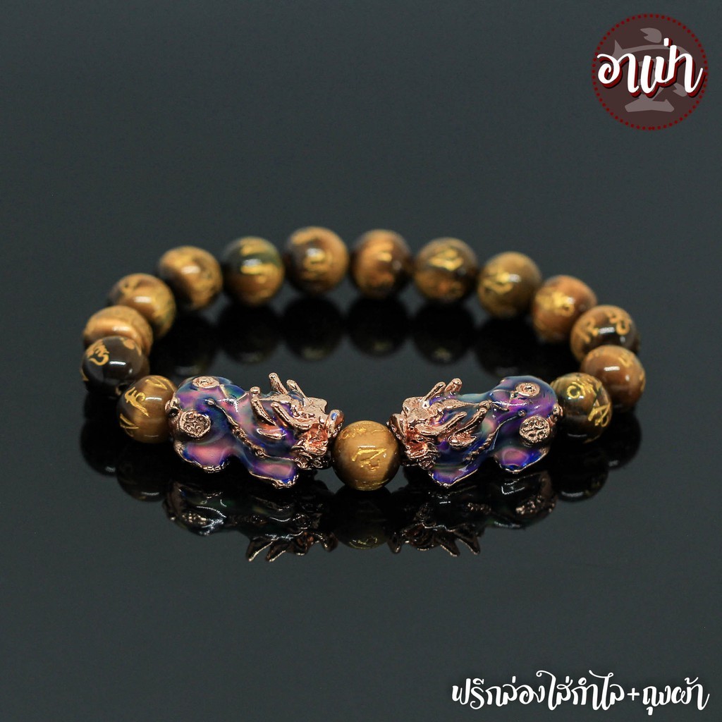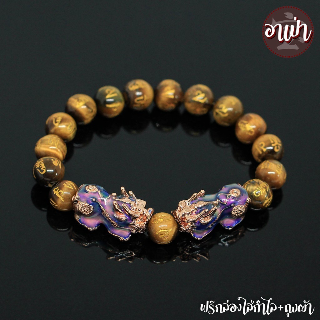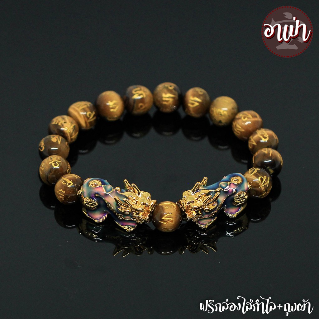 หินไทเกอร์อายส์ พลอยตาเสือ แกะสลักบทสวดมนต์ทิเบต Tiger Eye ขนาด 10 มิล ปี่เซียะเปลี่ยนสีคู่ หินแท้ 100% หินตาเสือ