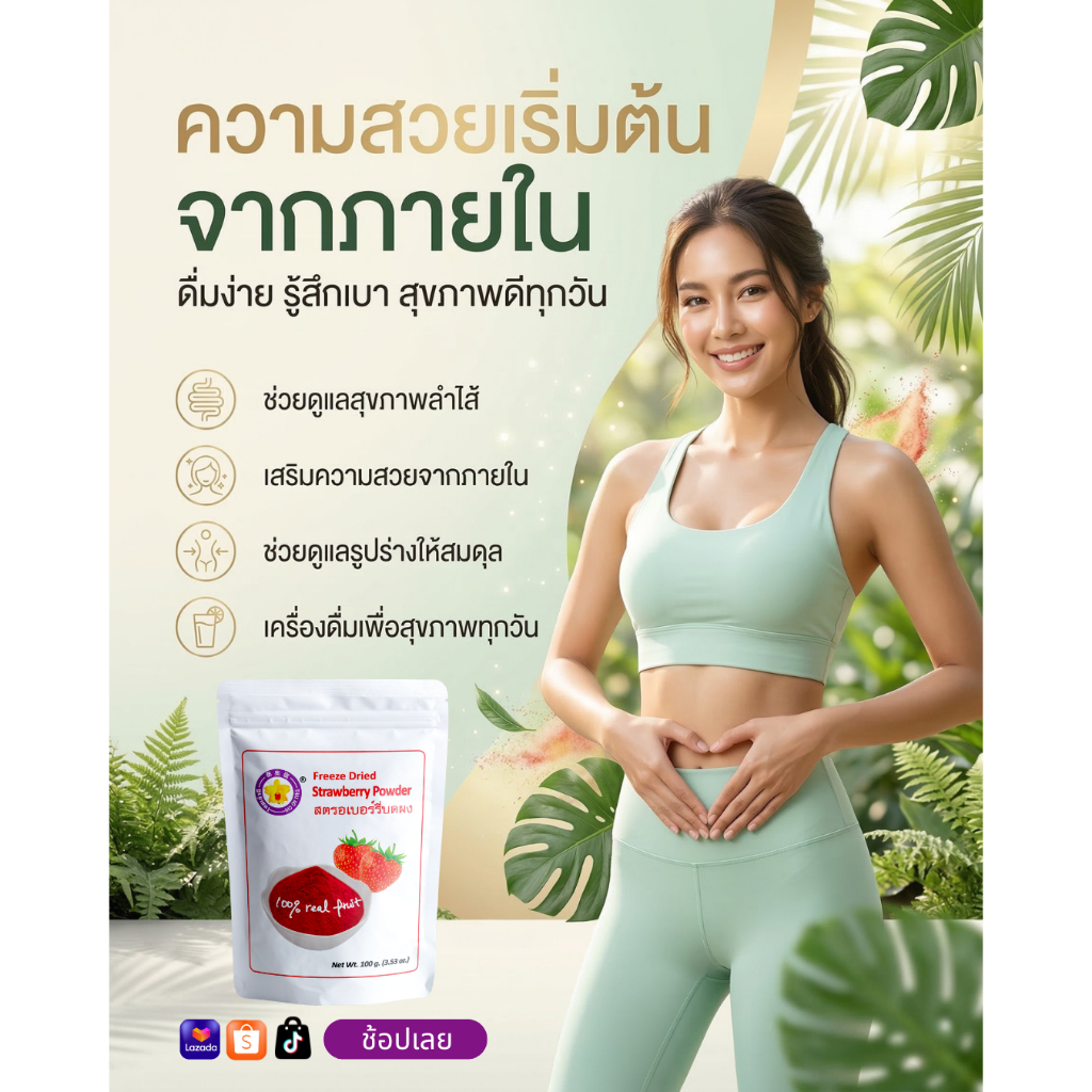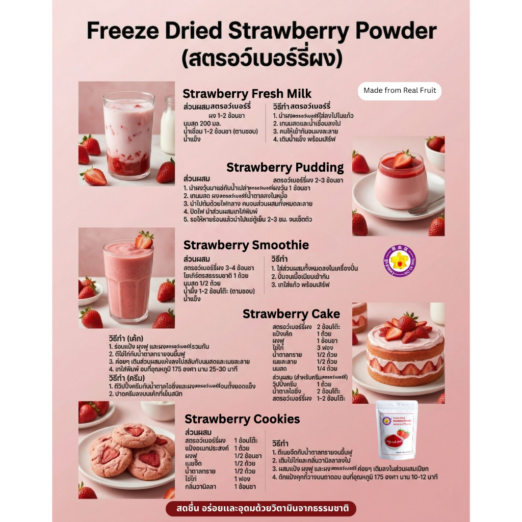 สตรอเบอร์รี่บดผงฟรีซดราย 100 กรัม Thaiaochi (สตรอเบอร์รี่100%) ใช้ได้ทุกเมนูชงดื่ม เบเกอรี่ สมูทตี้