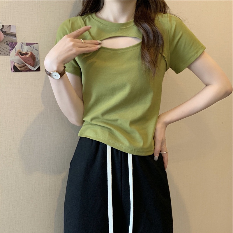 【WJZ】เสื้อยืดแขนสั้นดีไซน์กลวงเซ็กซี่สไตล์เกาหลีสำหรับผู้หญิง.【9971】