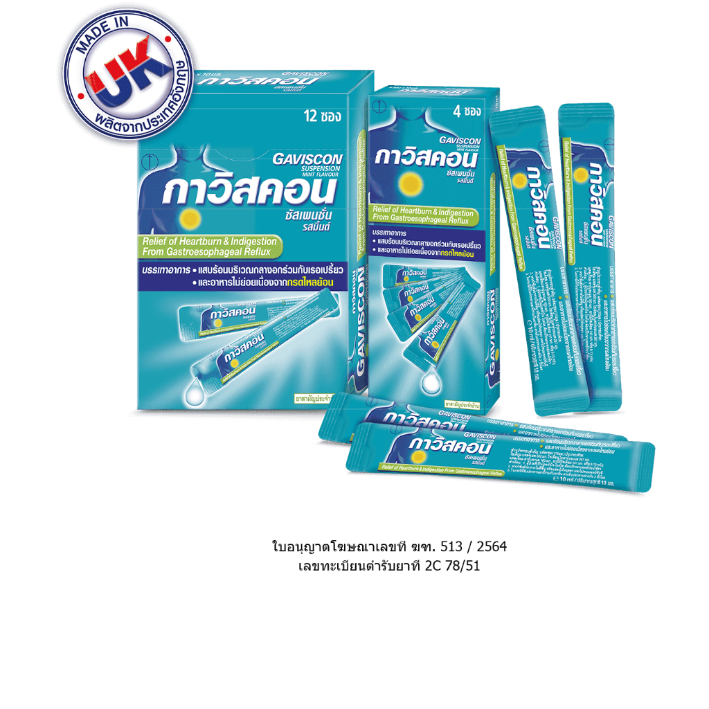 Gaviscon 10ml suspension ดั้งเดิม กาวิสคอน ช่วยบรรเทาอาการแสบร้อนกลางอกจากโรคกรดไหลย้อน สามัญประจำบ้าน