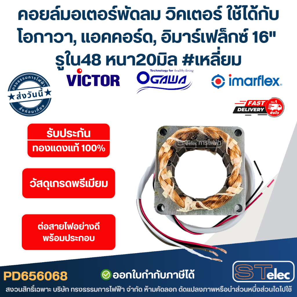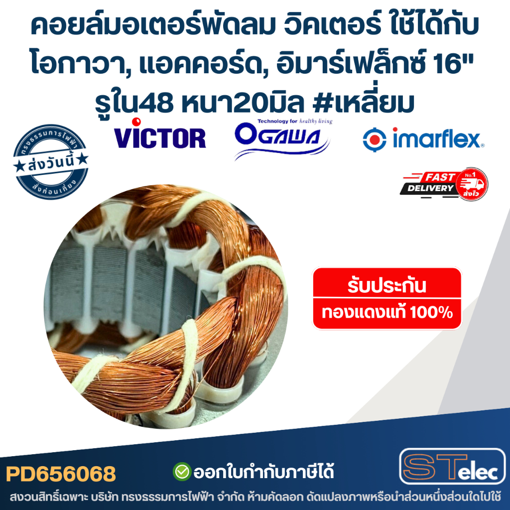 (15) คอยล์มอเตอร์พัดลม วิคเตอร์ ใช้ได้กับโอกาวา, แอคคอร์ด, อิมาร์เฟล็กซ์ 16" รูใน48 หนา20มิล #เหลี่ยม รับประกัน ทองแดงแท