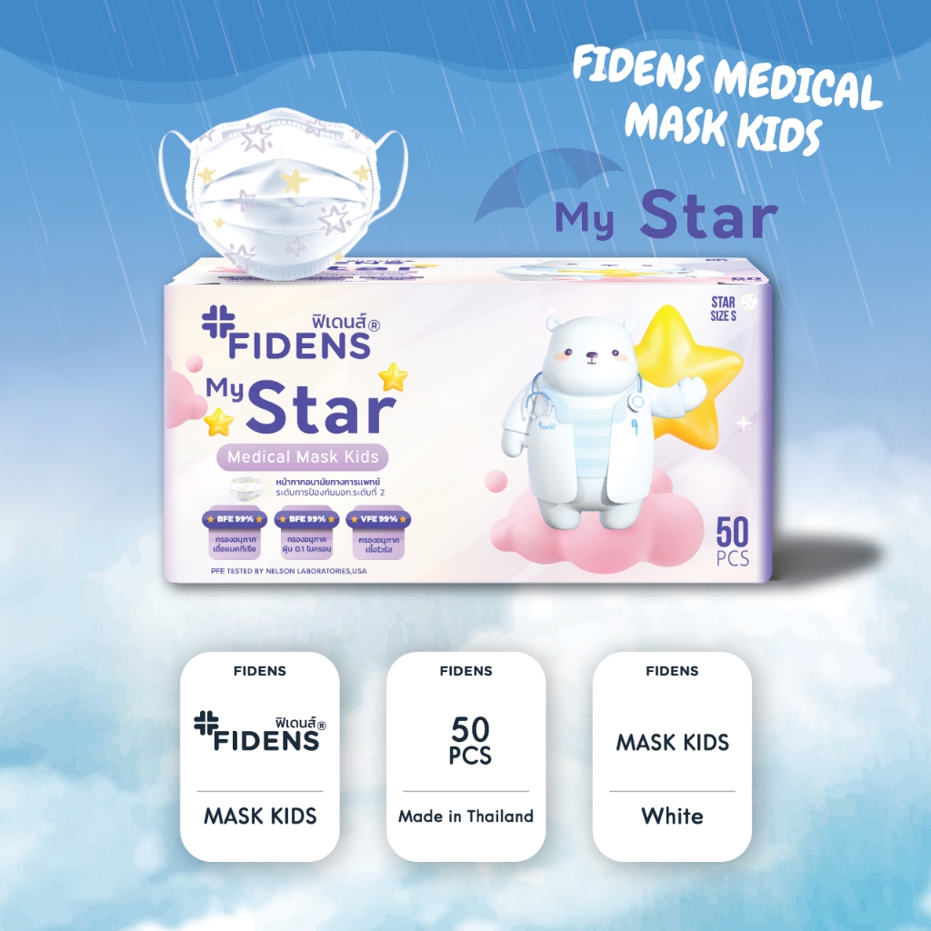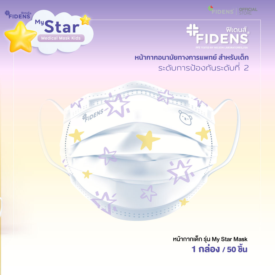 FIDENS MASK KIDS STAR ฟิเดนส์ หน้ากากอนามัยทางการแพทย์สำหรับเด็ก 3 ชั้น รุ่นMEDICAL MASK KIDS 1 กล่อง 50 ชิ้น #2198