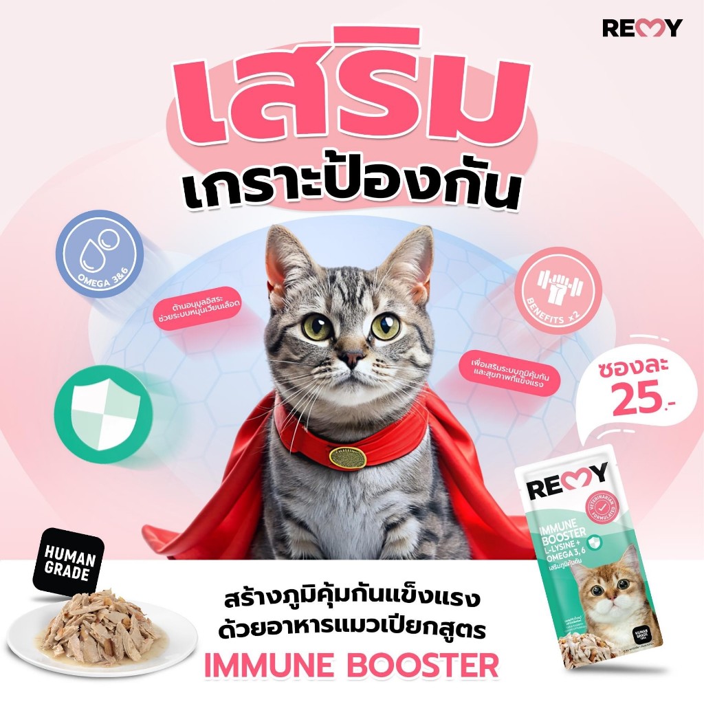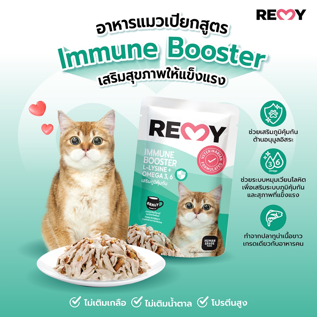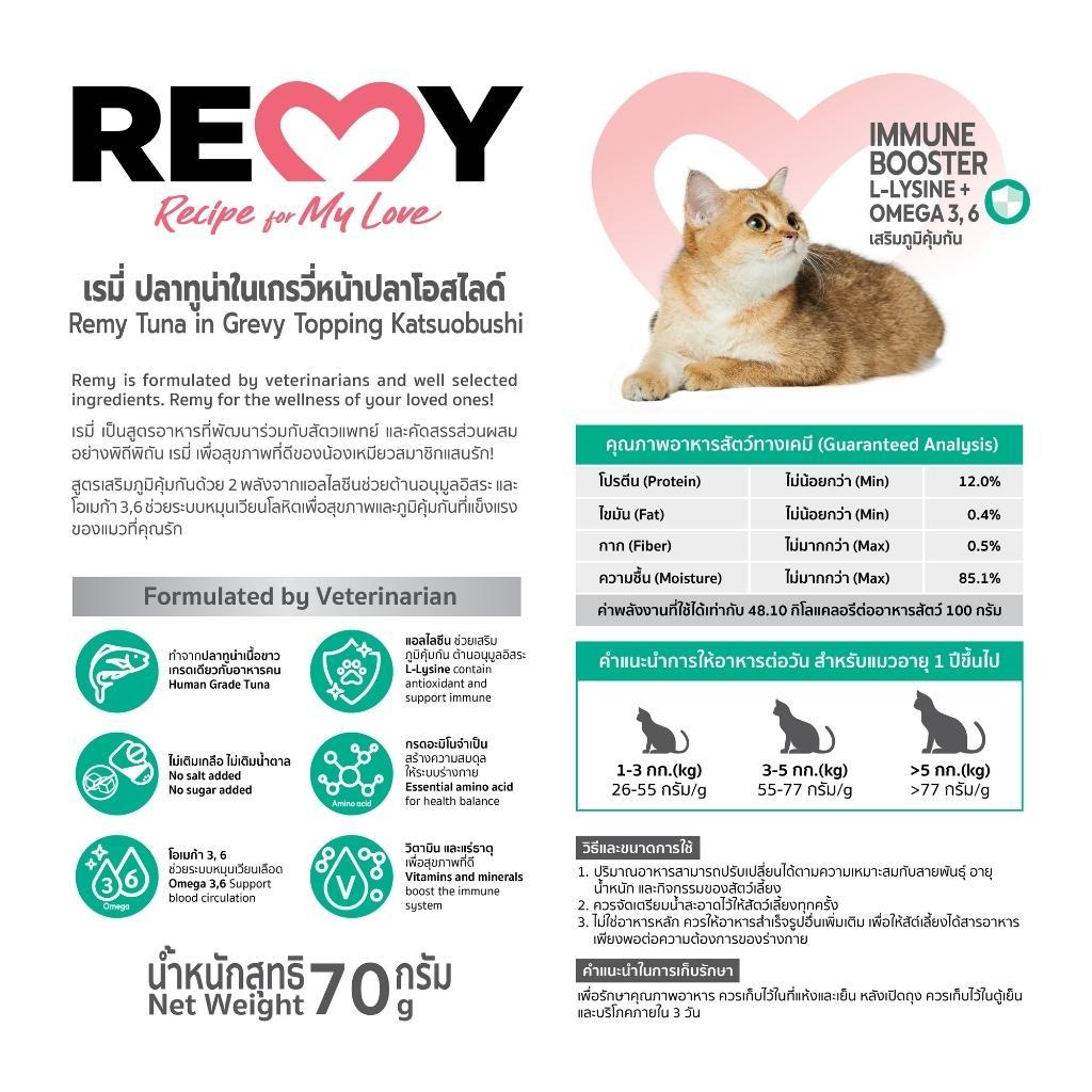 เรมี่ อาหารแมว ปลาทูน่าในน้ำเกรวี่หน้าปลาโอสไลด์ สูตรเสริมภูมิคุ้มกัน x 1 กล่อง (12 ซอง)
