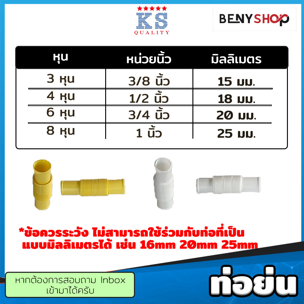 ท่อย่น แพค 10 ชิ้น ยาว 18 ซม. ขนาด 3/8"(3หุน), 1/2"(4หุน), 3/4"(6หุน) สีเหลือง ขาว ตรา KS