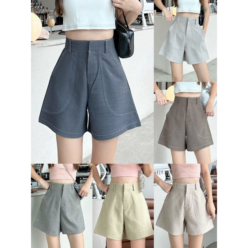 (ไม่ผลิตเพิ่ม) BEMYCHIC กางเกงขาสั้นเอวสูงผู้หญิง กางเกงขาสั้นผ้าโซดาเดินด้าย เดินตะเข็บคู่ รุ่น Buddy shorts