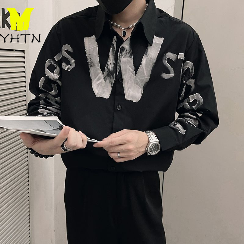 YHTN เสื้อเชิ้ตผู้ชายสีดำ เสื้อเชิ้ตผู้ชาย เท่ๆ เสื้อเชิ้ตลำลองผู้ชาย แฟชั่น เสื้อเชิ้ต เชิ้ตดํา