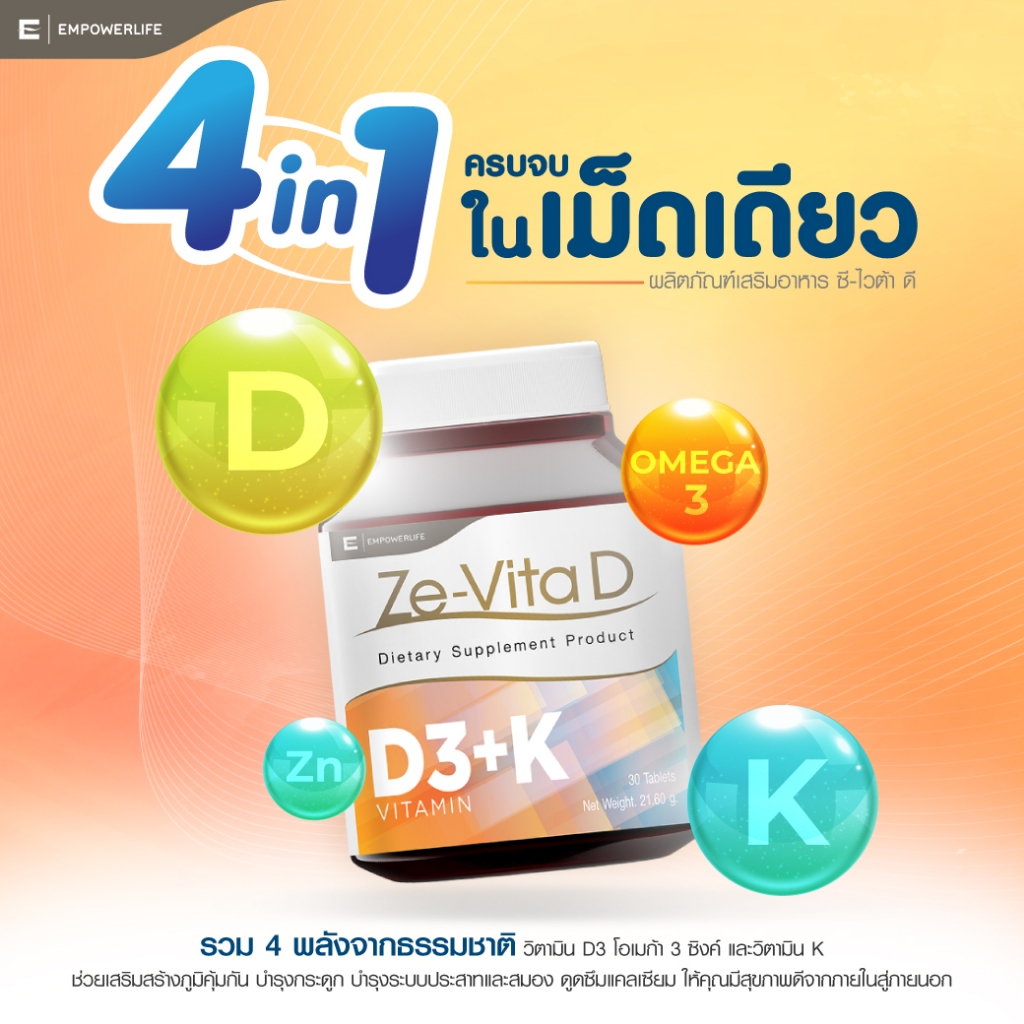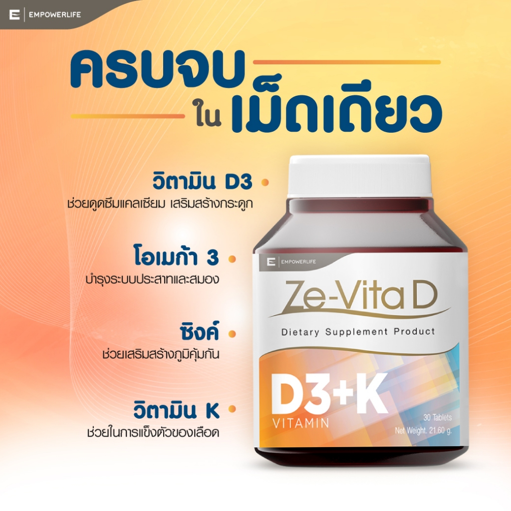 Ze-Vita D 30 เม็ด เสริมภูมิต้านทาน ช่วยดูดซึมแคลเซียมเสริมสร้างกระดูก วิตามินดี 3 Vitamin D3 + K [ Ze-Vita D 30 เม็ด]