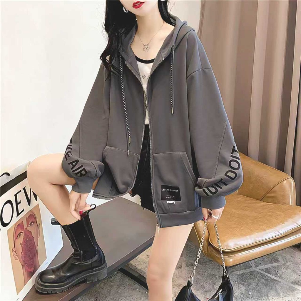 เสื้อแขนยาว Oversize {อก 58-64 นิ้ว} ซิปหน้า มีฮู้ด สีพื้น พิมลายที่แขนสองข้าง ผ้าคอตตอน B14