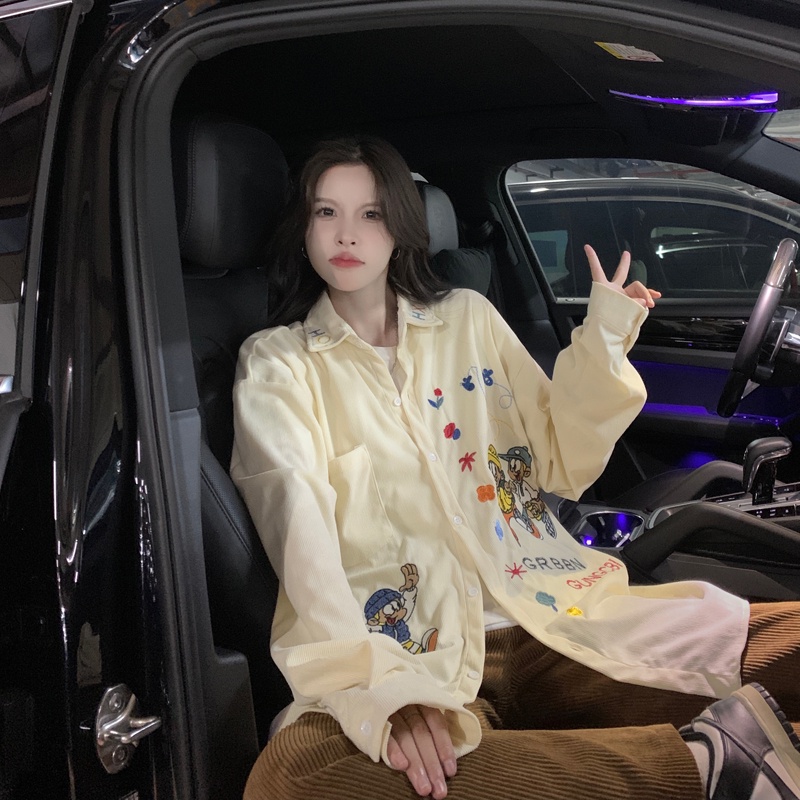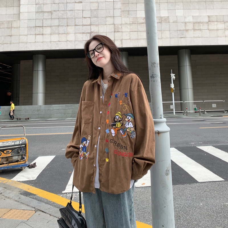 ฤดูใบไม้ร่วงใหม่วินเทจสนุกการ์ตูนเย็บปักถักร้อยผ้าลูกฟูกหลวมแขนเสื้อผู้หญิง