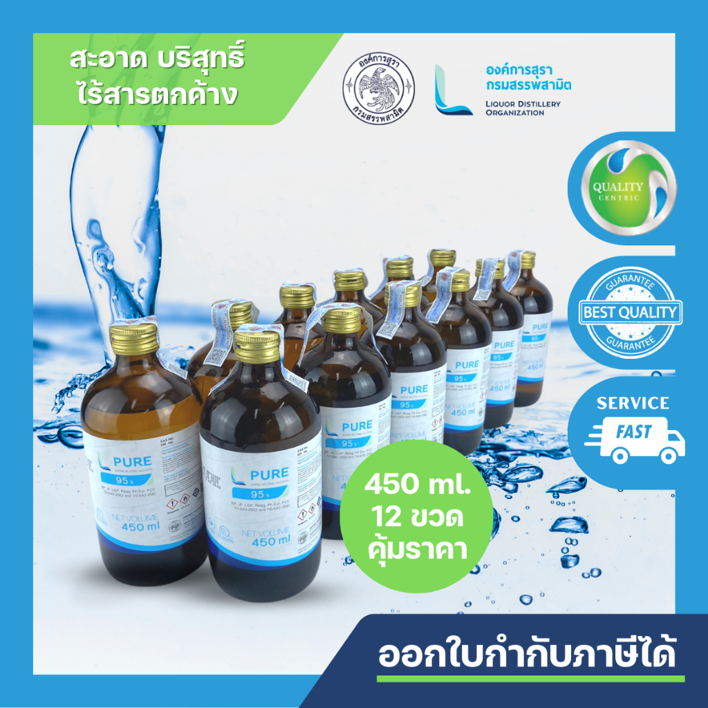 L PURE 95 (ETHYL ALCOHOL 95% - 450 ML) แพ็คละ 12 ขวด/ FOOD GRADE/ สำหรับ คลินิคแพทย์แผนจีนและไทย