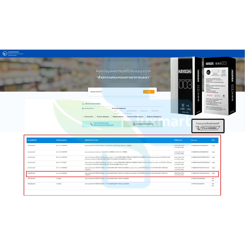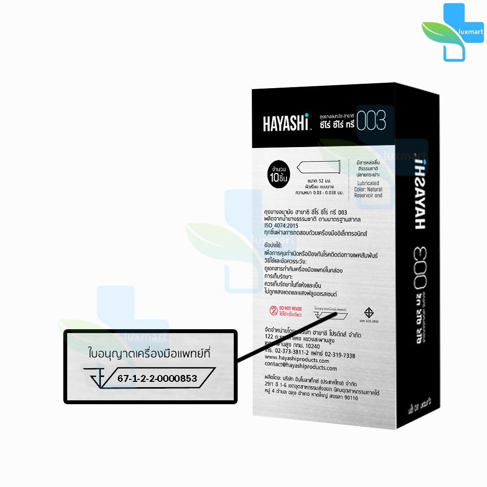 Hayashi 003 ถุงยางอนามัย ฮายาชิ 003 ขนาด 52 มม. บรรจุ 10 ชิ้น [2 กล่อง] EXP05/2026 JJ 5132 บาง 0.03 มม. แบบบางพิเศษ
