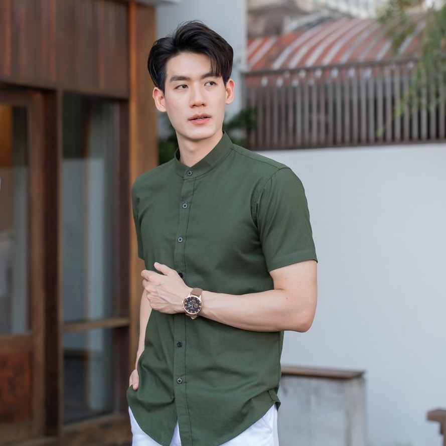 (16 สี) เสื้อเชิ้ตคอจีนแขนสั้น รุ่นกระดุมยาว ผ้า OXFORD (ไซต์ S-XXL) เสื้อผ้าผู้ชาย