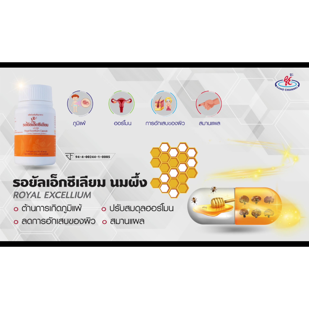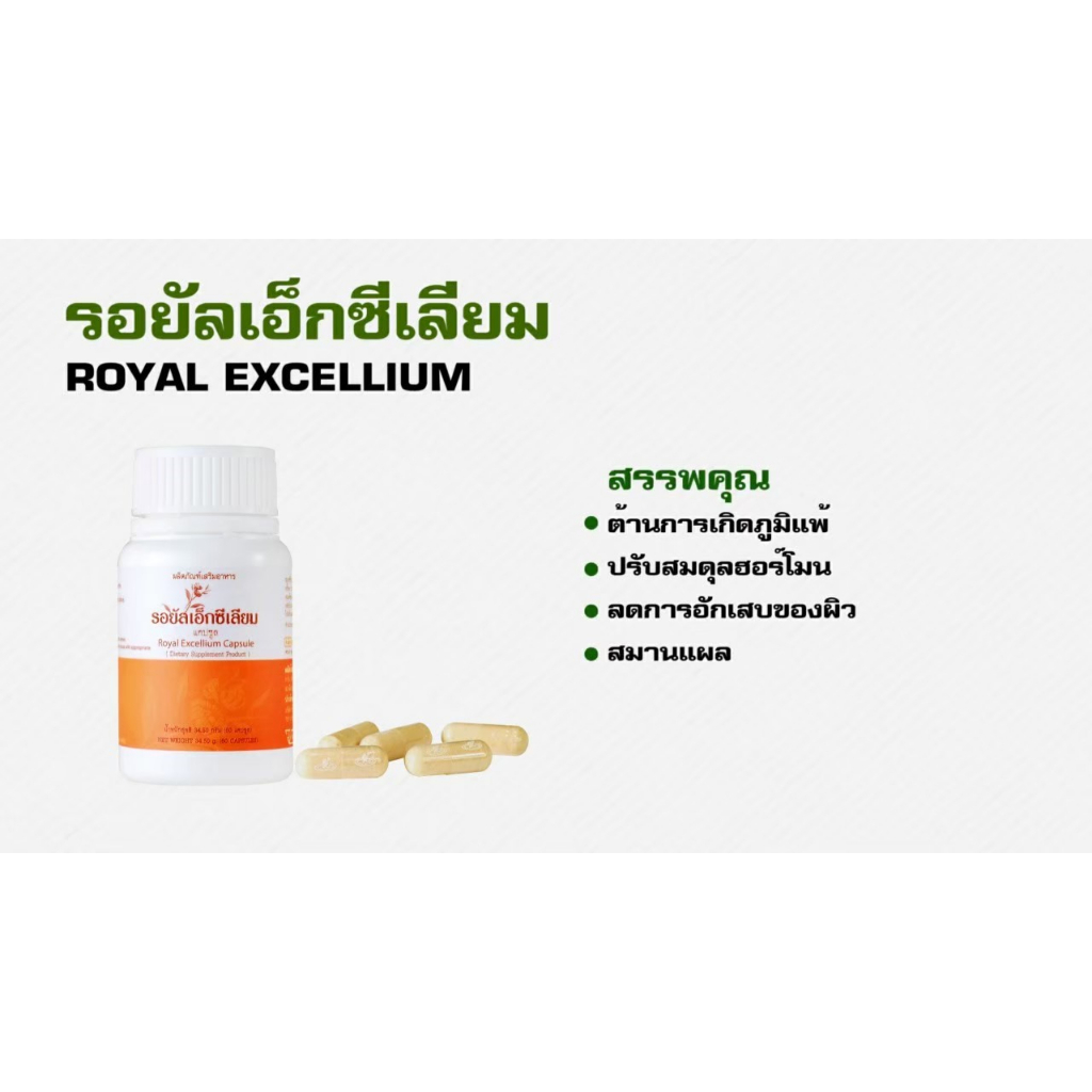 รอยัลเอ็กซีเลียม (Royal Excellium) คือความพรีเมียมของผลิตภัณฑ์เสริมอาหารเพื่อสุขภาพจริงๆ ครับ การผสมผสานที่ลงตัวระหว่างนมผึ้ง (Royal Jelly) และเอ็กซีเลียมจากเห็ดหลินจือช่วยฟื้นฟูร่างกายและเสริมสร้างภูมิคุ้มกันได้อย่างดีเยี่ยม ไฮไลท์พรีเมียมคือคุณประโยชน์ที่ช่วยบำรุงระบบประสาทและทำให้หลับสนิทขึ้น แคปซูลคุณภาพพรีเมียมกลืนง่ายและร่างกายสามารถดูดซับสารอาหารไปใช้งานได้รวดเร็ว มั่นใจในคุณภาพระดับสากลจาก Gano Excel คุ้มค่าและพรีเมียมที่สุดสำหรับการดูแลสุขภาพในระยะยาวครับ