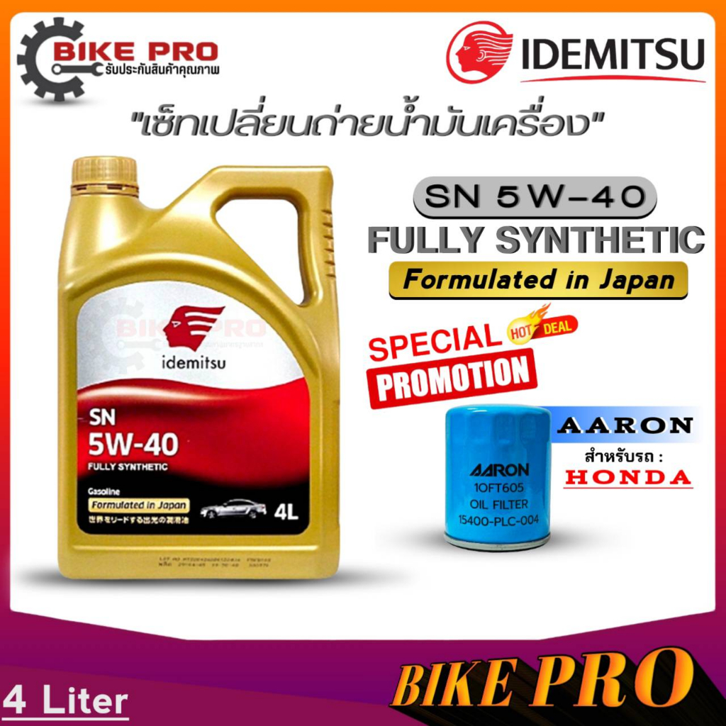 น้ำมันเครื่องเบนซิน IDEMITSU Fully Synthetic 5w-40 SN สังเคราะห์แท้100% (ขนาด 4 ลิตร) แถมฟรีกรองเครื่องHonda (AARON1ลูก)