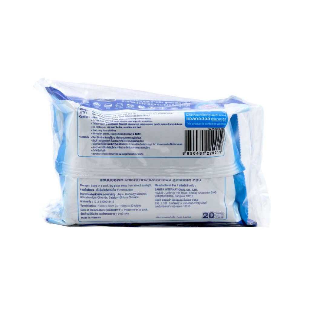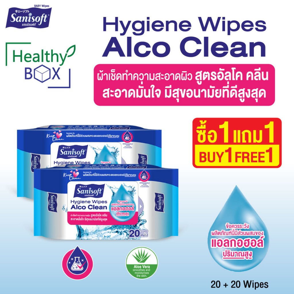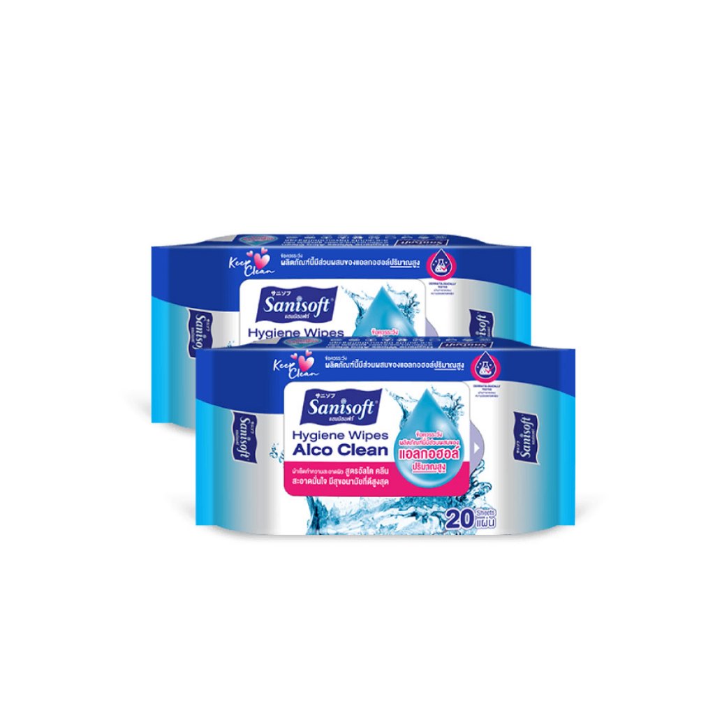 1 แถม 1 Sanisoft Hygiene Wipes Alco Clean 20Sheets แซนนิซอฟท์ ผ้าเช็ดทำความสะอาดผิว สูตรอัลโค คลีน 20+20 แผ่น