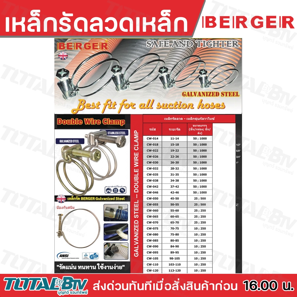 BERGER เหล็กรัดลวดเหล็ก CW-014-CW-120 หลายขนาด ระยะรัด 11-120 รัดแน่นหนา เหล็กรัดลวด ป้องกันสนิม CW เหล็กรัด กิ๊บรัด เหล