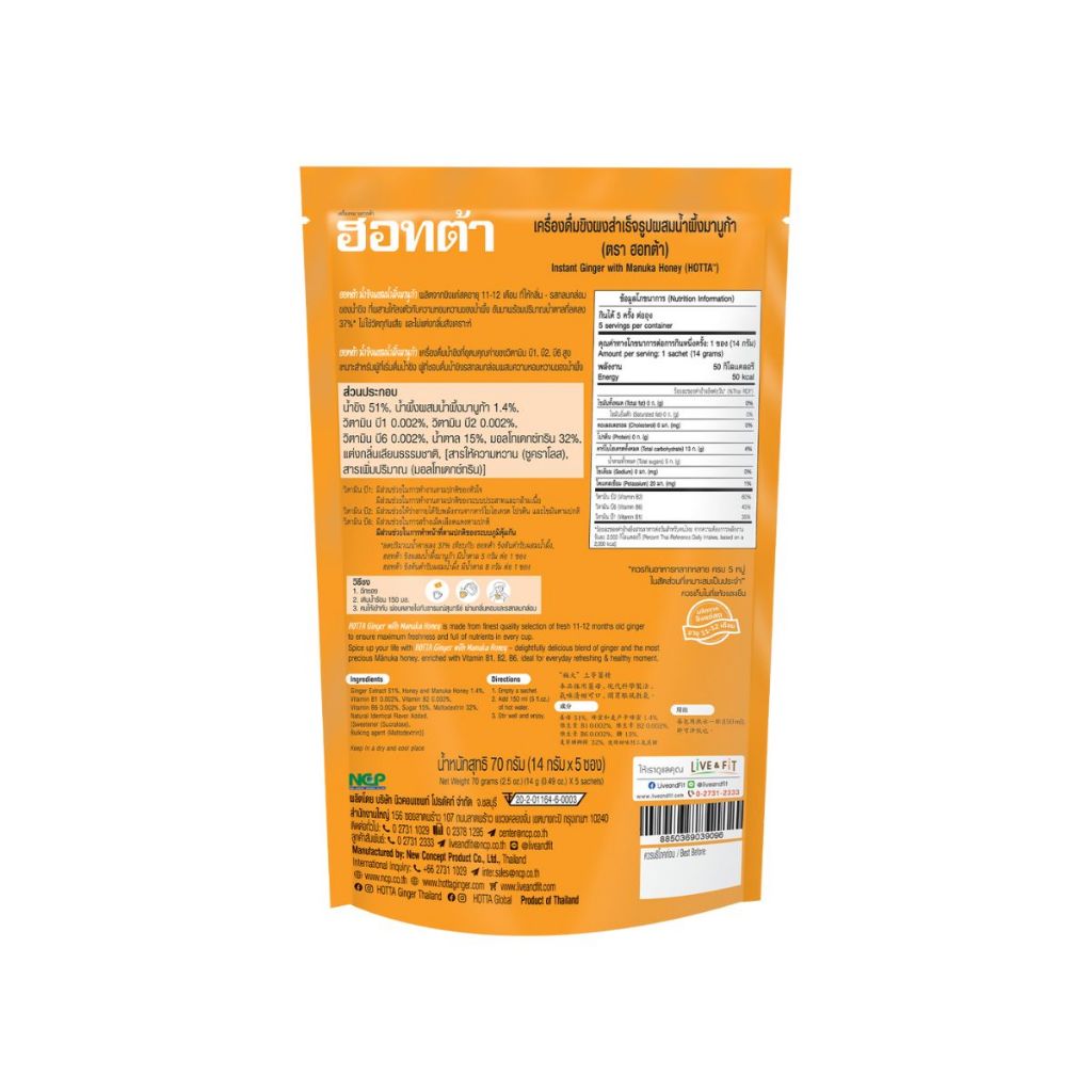 HOTTA น้ำขิงฮอทต้า เครื่องดื่มสมุนไพรขิงผงสำเร็จรูป ขิงน้ำผึ้งมานูก้า ขนาด 5 ซอง