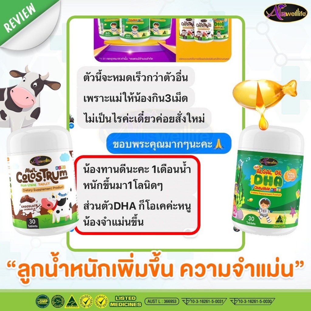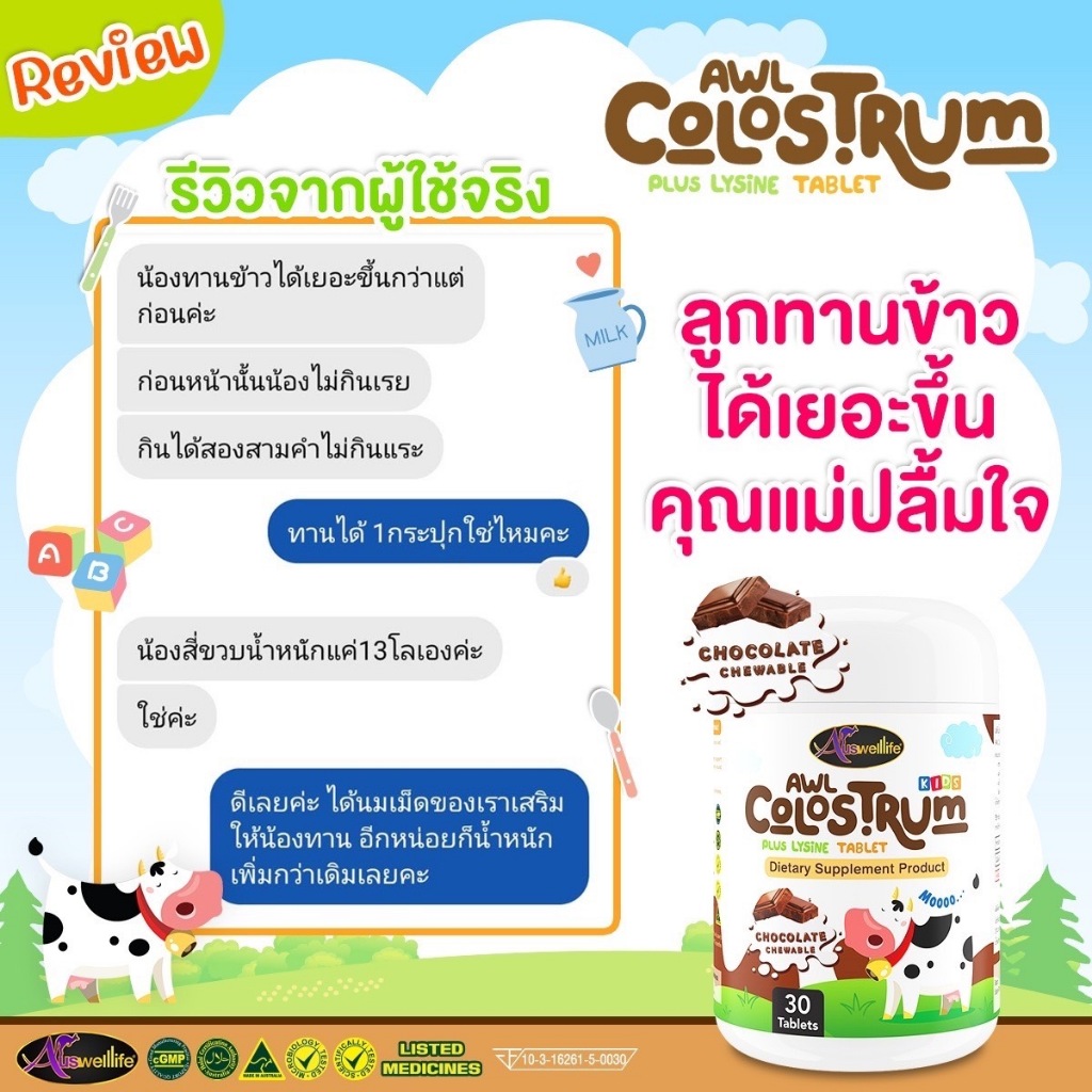 [3 แถม 2] นมเม็ด AWL COLOSTRUM PLUS LYSINE ขนาด 30 เม็ด 3 กระปุก แถมฟรี 2 กระปุก (Auswelllife)