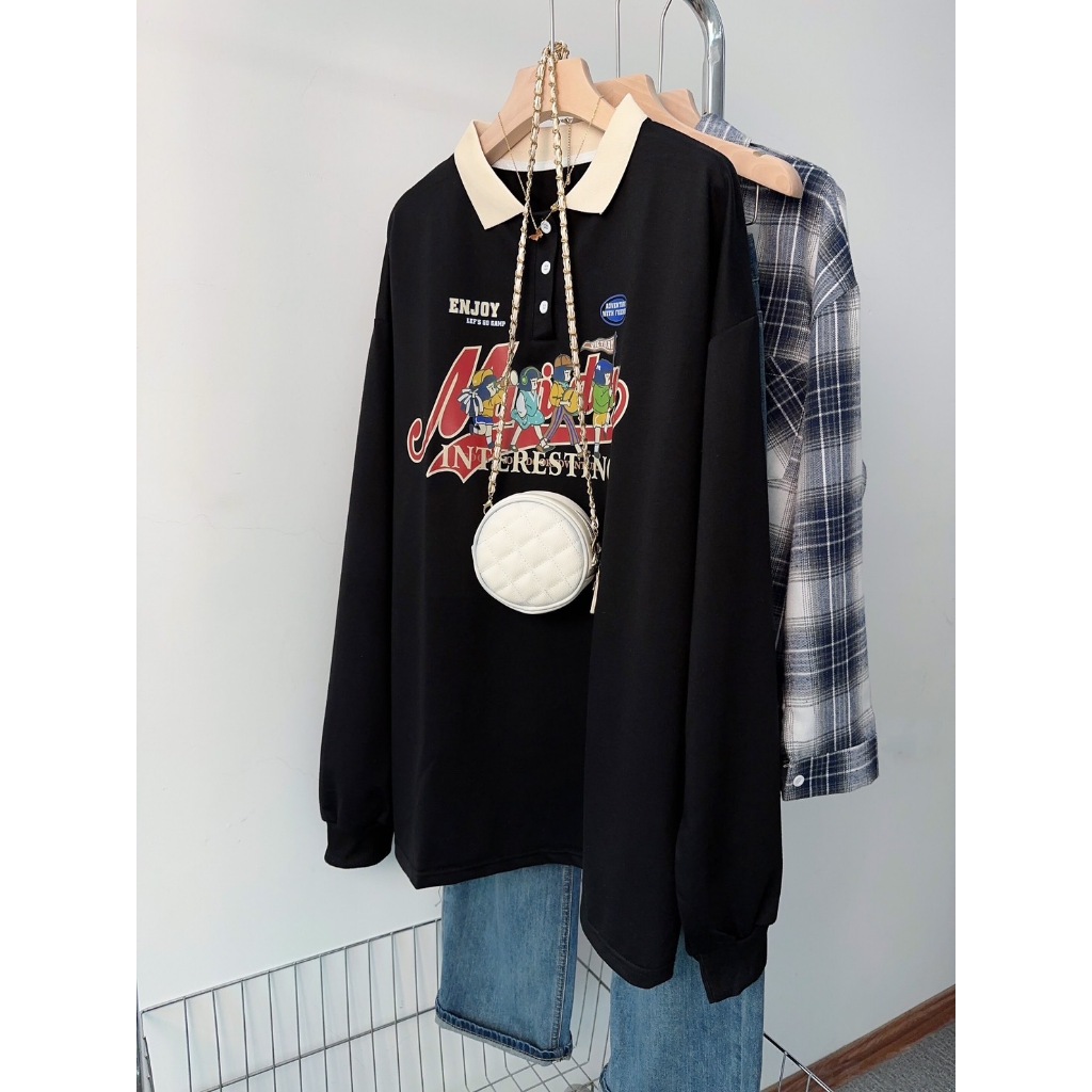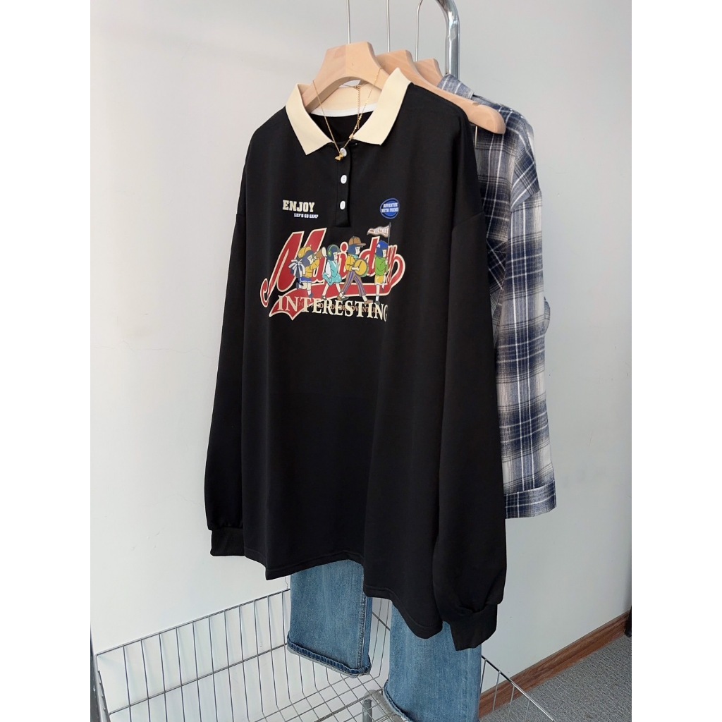 เสื้อแขนยาวคอปก Oversize (อก 50-60 นิ้ว) สกีลลายคน 4 คนด้านหน้า ผ้าคอตตอล B93