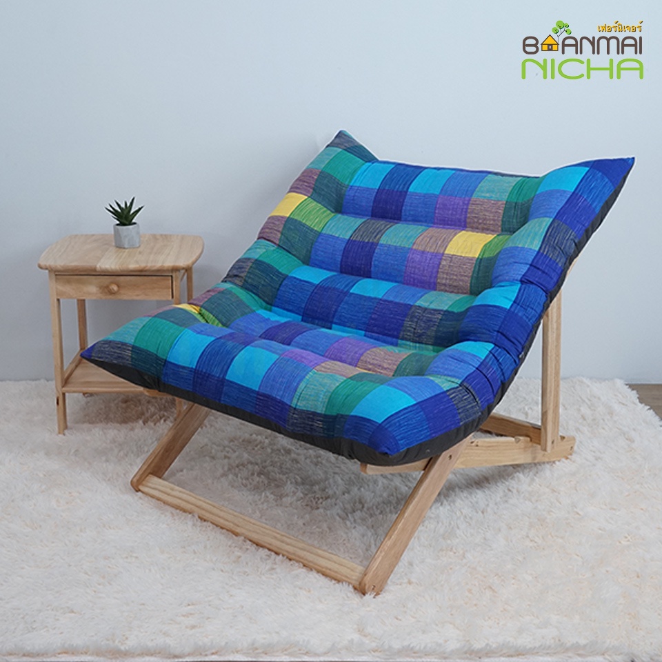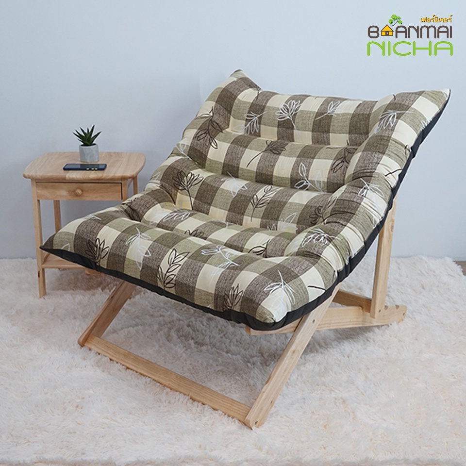 เก้าอี้พักผ่อนเอนนอน พับเก็บได้ แถมผ้าคุลมเบาะ ขนาดใหญ่ *ไม่มีวางเท้า* ไม้ยางพารา Baanmainicha