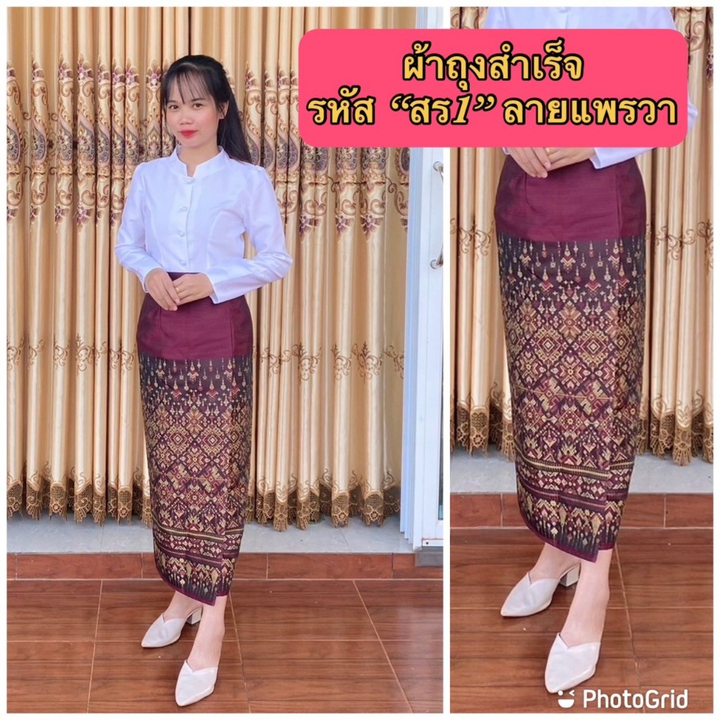 ผ้าถุงสำเร็จ รหัส "สร1" ลายแพรวา ผ้าไหมพรทิพย์ ตัดอัดกาว ตะขอ ซิปหลัง ลายผ้าถุงทอ