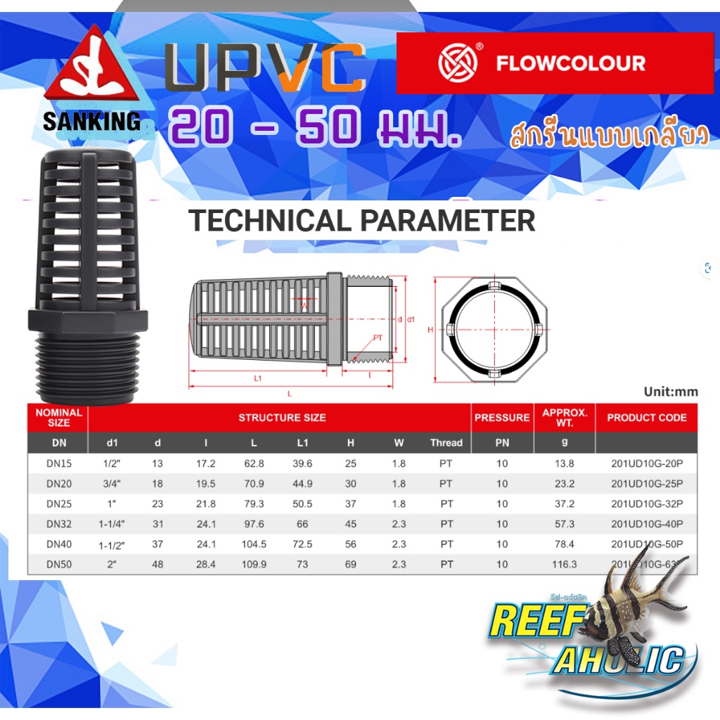 Reef-Aholic Flowcolour ตะแกรงกั้นปลายท่อ UPVC 20 - 50 mm. แบบเกลียว และแบบสอดในข้อต่อ ไม่ลดแรงดูด