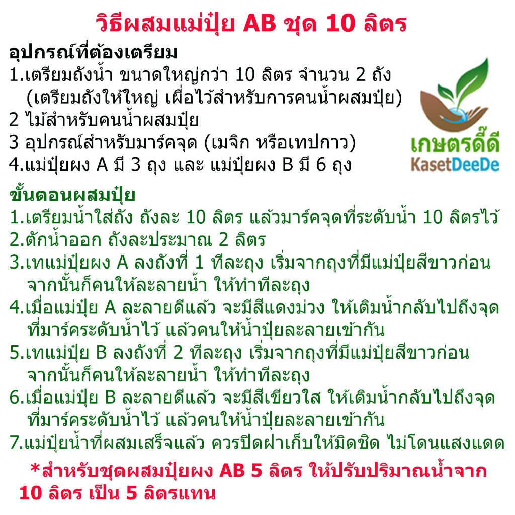 ปุ๋ย AB 5/10 ลิตร แบบแห้ง ปุ๋ยไฮโดรโปนิกส์ เข้มข้น ทนร้อน ใช้ได้ทั้งน้ำนิ่งน้ำวน ปุ๋ยคุณภาพ ราคาประหยัด