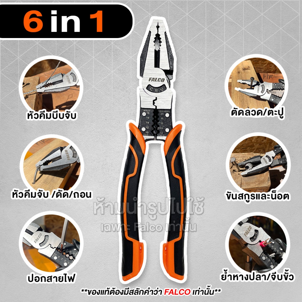 FALCO คีมปากรวม 6in1 คีมตัดสายไฟ คีมตัดลวด CR-V คีมปากจระเข้ คีมอเนกประสงค์ มาตรฐาน 8.5 นิ้ว