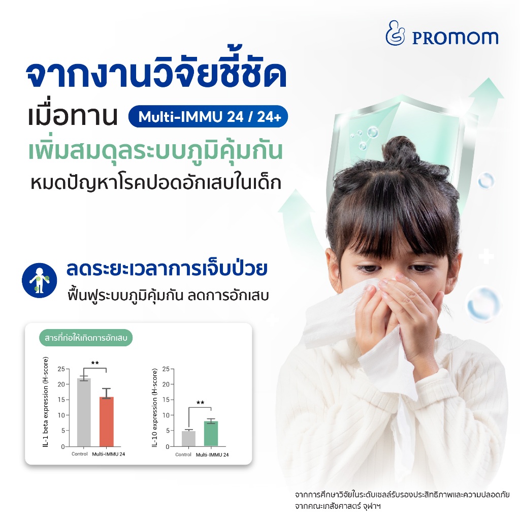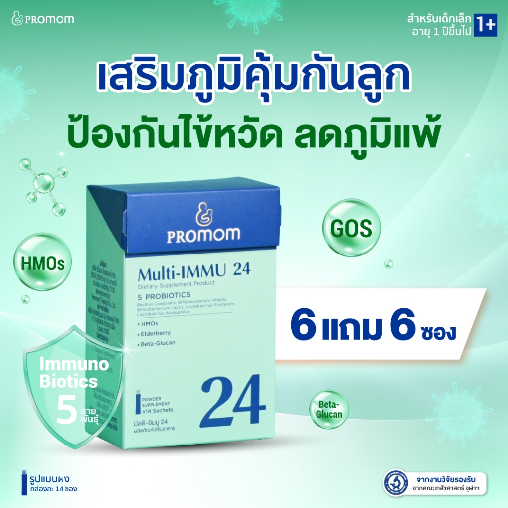 【6 กล่องแถม 6 ซอง】Promom Multi-IMMU 24 (รูปแบบผง สำหรับเด็ก 1 ปี+ รสเบอร์รี่) เสริมภูมิคุ้มกัน ลดภูมิแพ้ ป้องกันหวัด