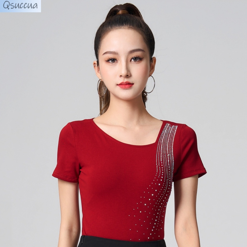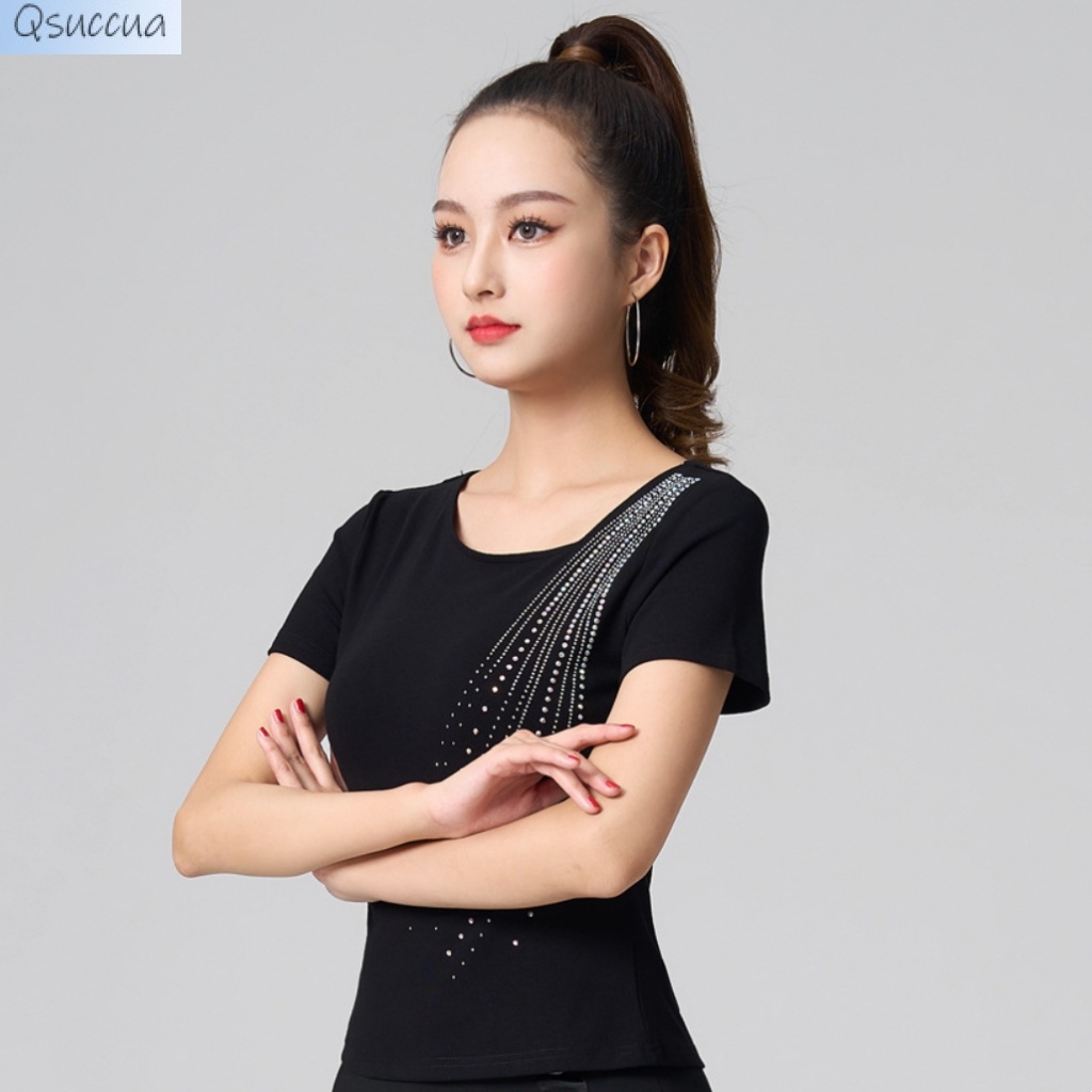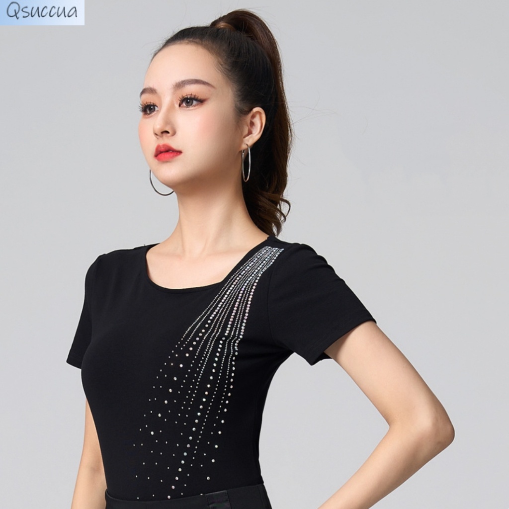 Qsuccua เสื้อท็อปแขนสั้น คอวี ประดับเพชร สําหรับผู้ใหญ่ เต้นรําละติน