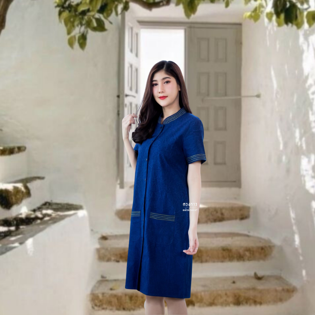 [ดวงดาวหม้อห้อมแพร่] เดรสหม้อห้อมคอจีนเข้ารูป/เดรสทางเอ ปักเดินเส้น รอบอก 34-56 นิ้ว