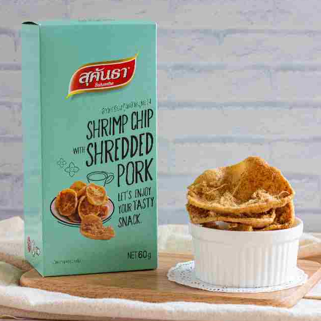 ขนมไทย สุคันธา ข้าวเกรียบกุ้งหน้าหมูหยองแบบกล่อง 60 กรัม ขนมอร่อยจากเพชรบุรี SUKANTHA Shrimp Chip Shredded-Pork Box