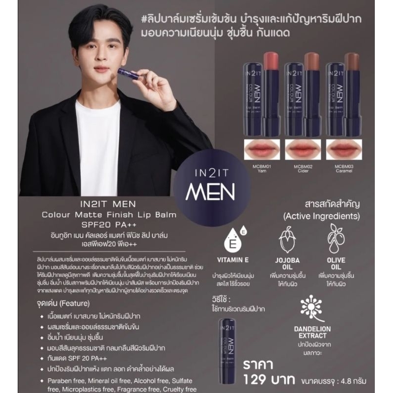 ลิปมัน ลิปบาล์ม สำหรับผู้ชาย IN2IT Men Colour Matte Finish Lip Balm SPF20 PA++ (MCBM) มี 3 เฉดสี มี 2 รุ่น เลือกได้