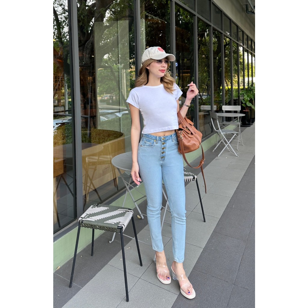 MOTTOM - LONDON กางเกงเอวสูง กระดุม 6 เม็ด ทรงสกินนี่ ปลายขากระบอก