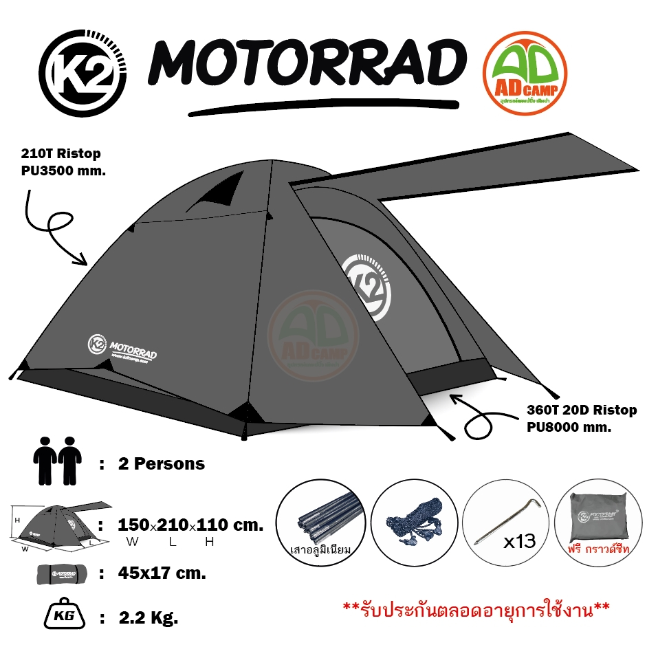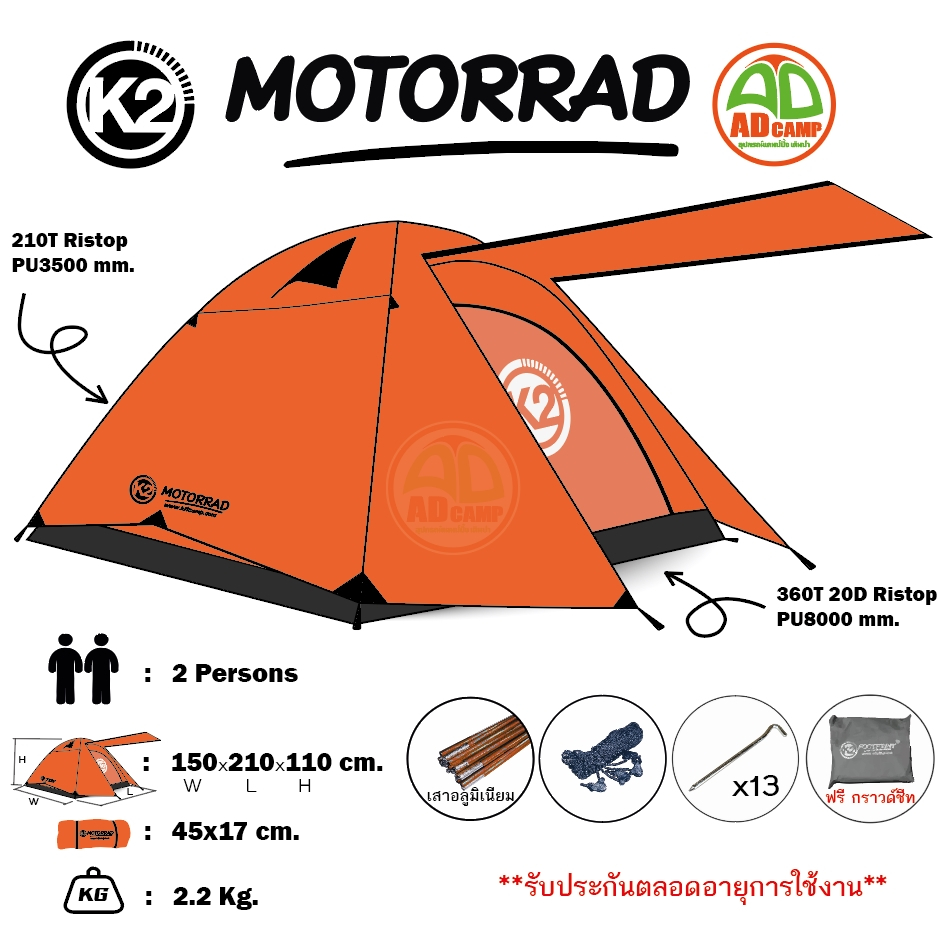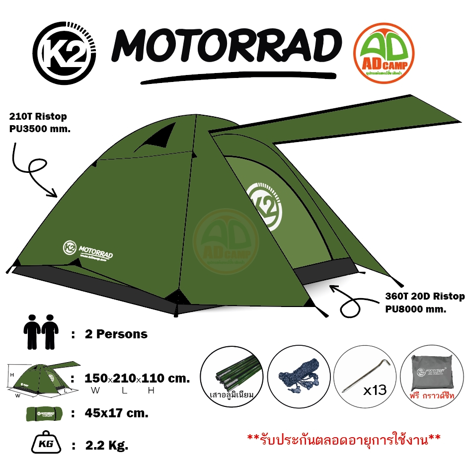 เต็นท์ K2 Motorrad เต็นท์แคมป์ปิ้ง 2 คนนอน แถมฟรีกราวด์ชีท กันน้ำ100% รับประกันตลอดอายุการใช้งาน