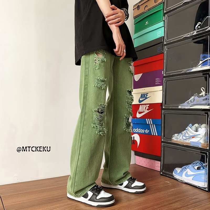 HANLU กางเกงยีนส์สีเขียวสไตล์อเมริกันของผู้ชายมีรูฉีกขอบดิบคุณภาพสูงอินเทรนด์ในกางเกงขายาวทรงตรงแนวสตรีท