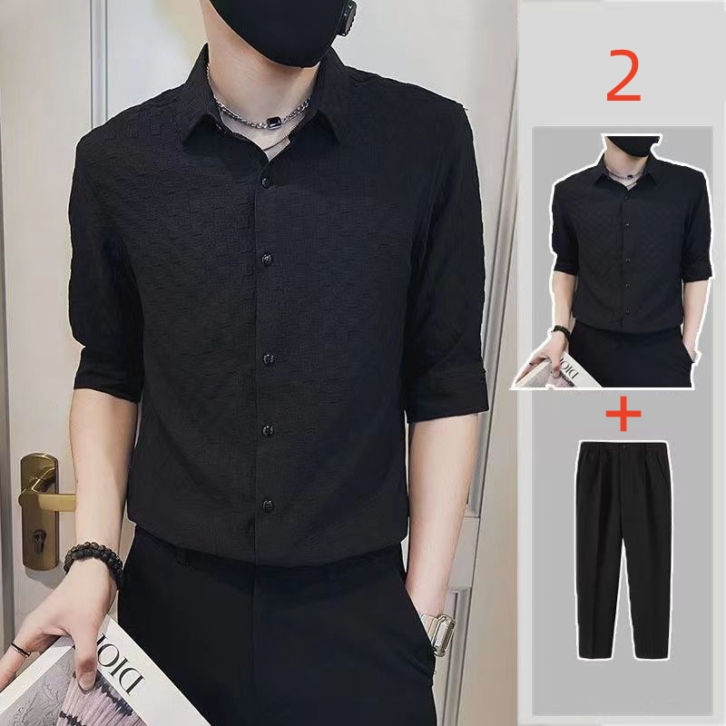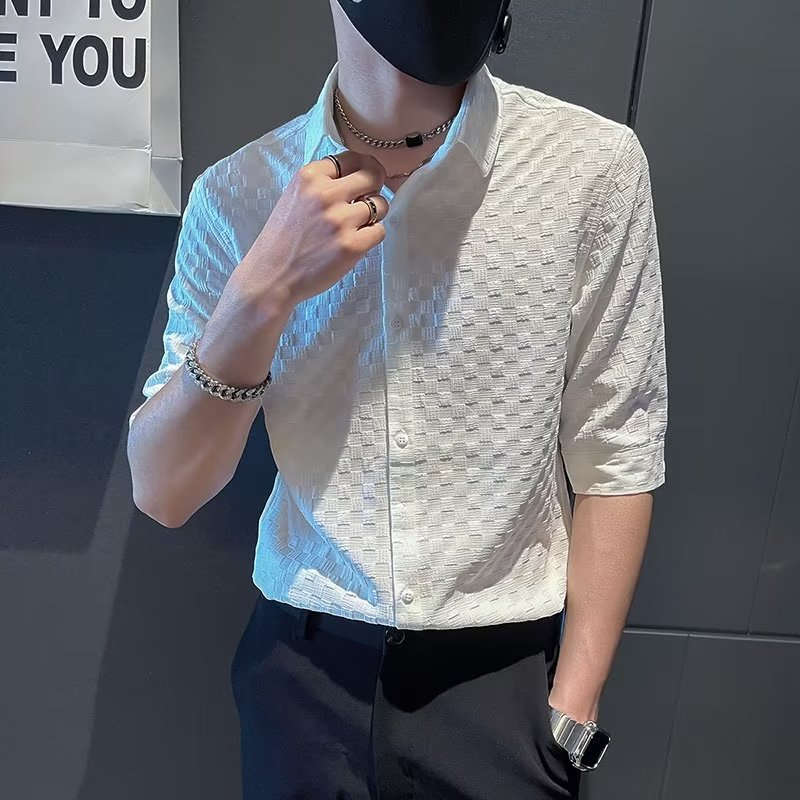[เสื้อ+กางเกง] จัดส่งจากประเทศไทย ถัก พื้นผิวตาหมากรุก เสื้อเชิ้ตแขนห้าส่วนลําลอง สีขาว แฟชั่นฤดูร้อน สไตล์สตรีท
