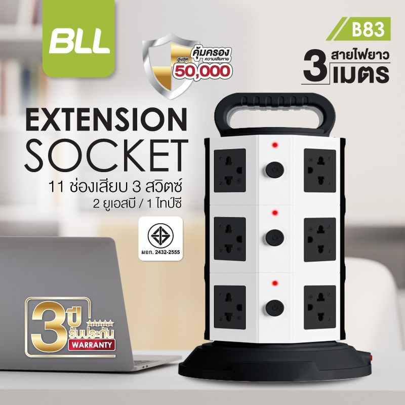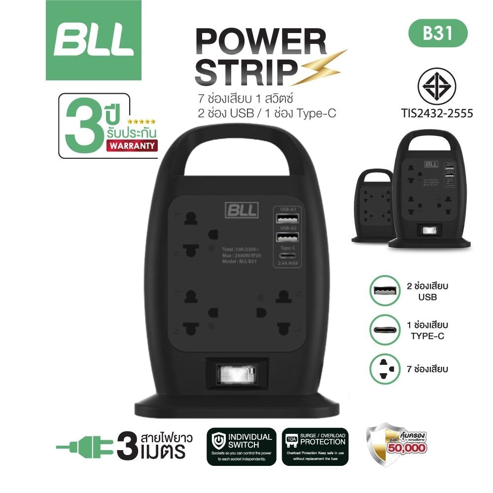 BLL รุ่นB83 /B31 /B33 ปลั๊กไฟคอนโด 3 ชั้น 3 สวิตต์ 11 ช่อง 2 USB 1 Type C สายยาว 3 เมตร มี มอก 2300w สินค้าพร้อมส่ง
