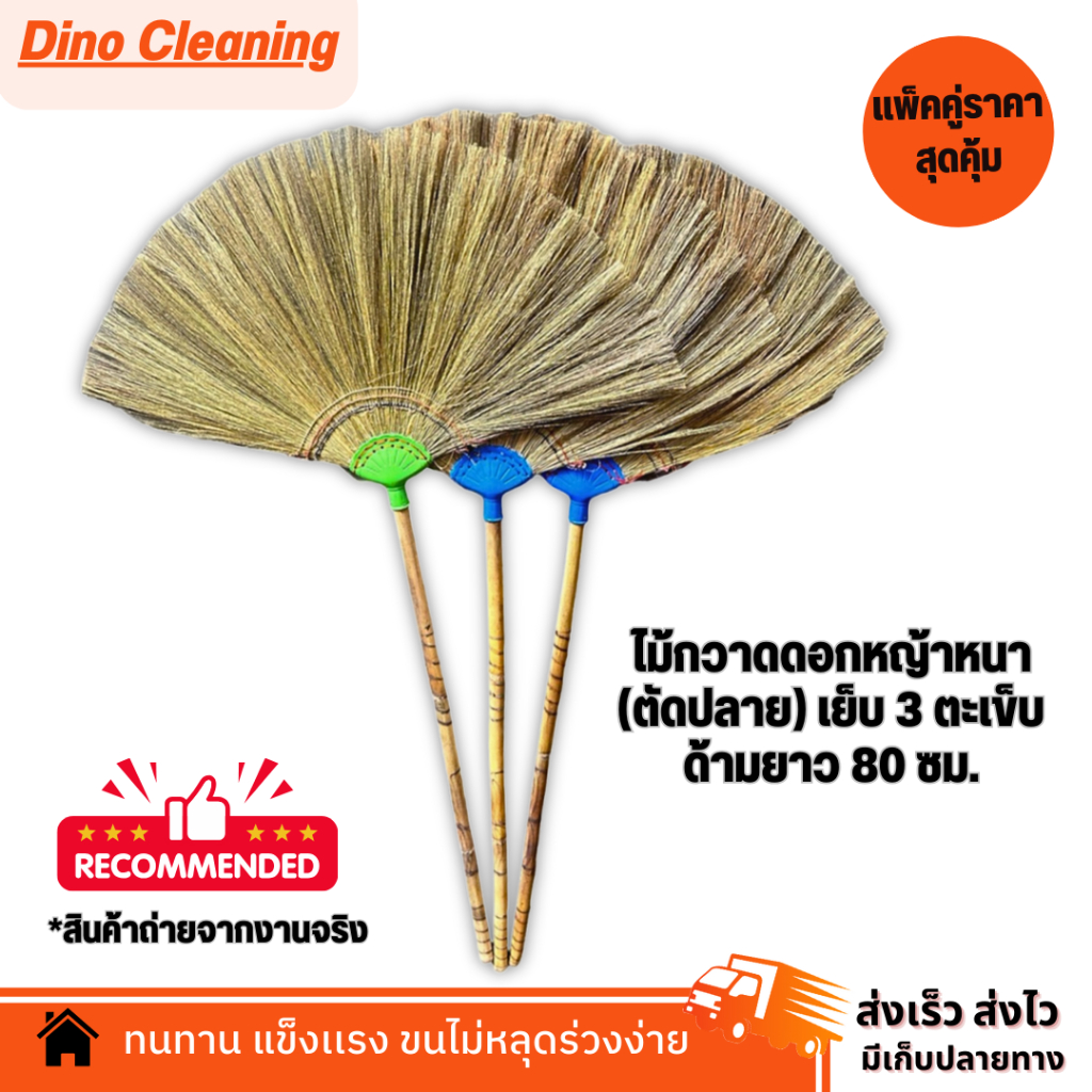 ไม้กวาดดอกหญ้าทำมือ งาน OTOP เย็บ 3 ตะเข็บ (ตัดปลาย) ทากาว ด้ามไม้ลายไทย 80 ซม. เกรด A