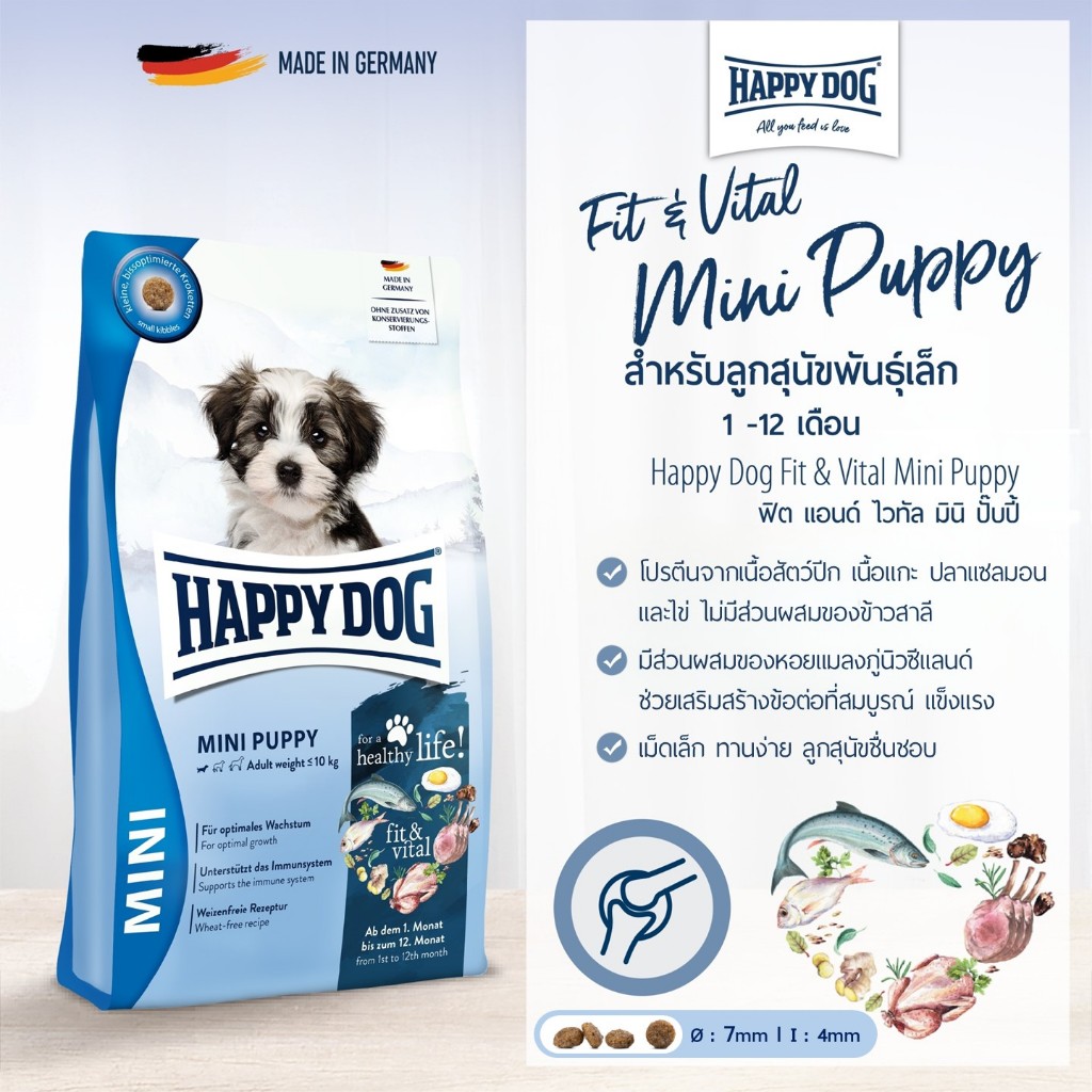 HAPPY DOG Fit & Vital Mini Puppy อาหารสูตรลูกสุนัขพันธุ์เล็ก เนื้อสัตว์ปีก เนื้อแกะ และแซลมอน 10 Kg