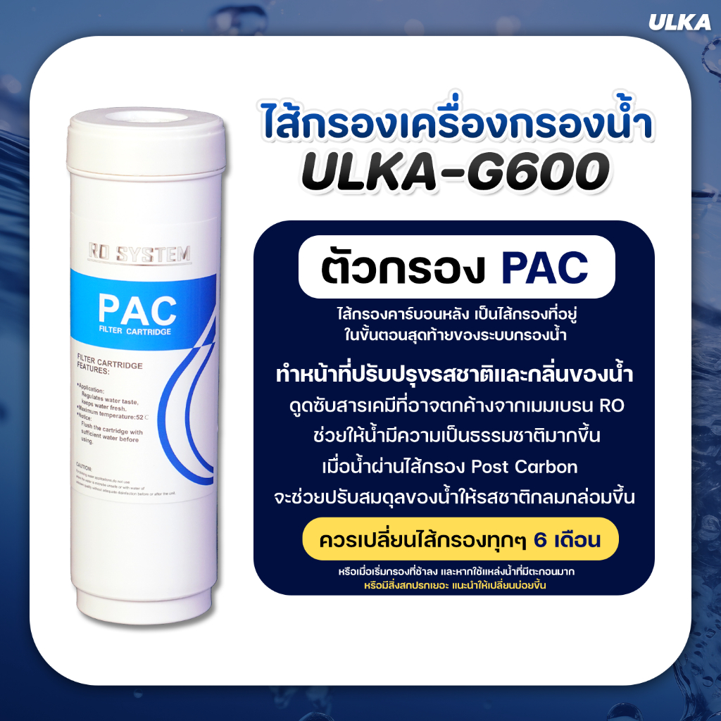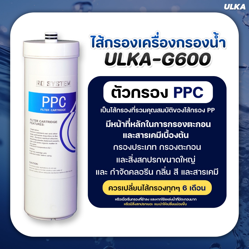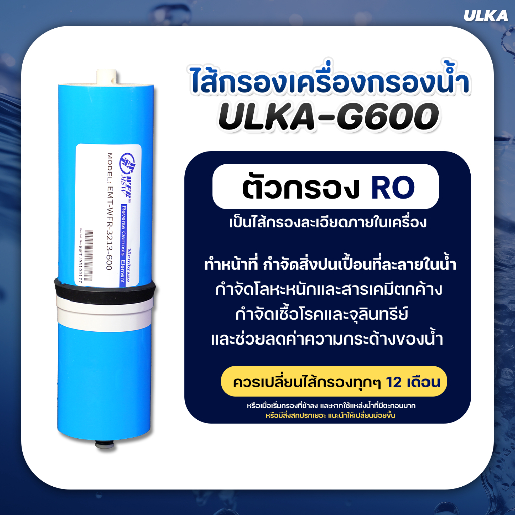 ไส้กรองเครื่องกรองน้ำ ULKA RO รุ่น G600 กรองน้ำดื่มสะอาด ปลอดภัย กำจัดคลอรีน สารพิษสิ่งปนเปื้อน สำหรับครอบครัว