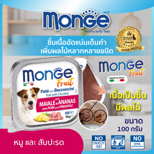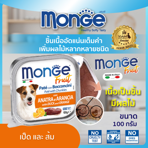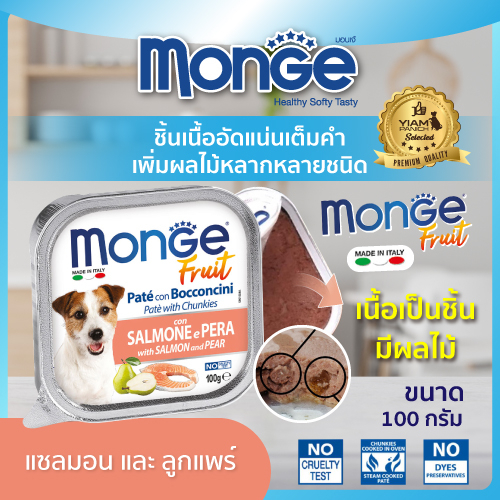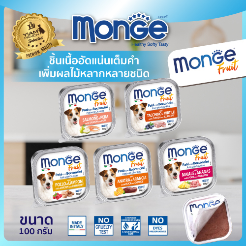 (12 ถาด ราคาพิเศษ) MONGE Fruit (มอนเจ ฟรุต) อาหารเปียกสำหรับสุนัขเกรดพรีเมียม ผสมเนื้อผลไม้