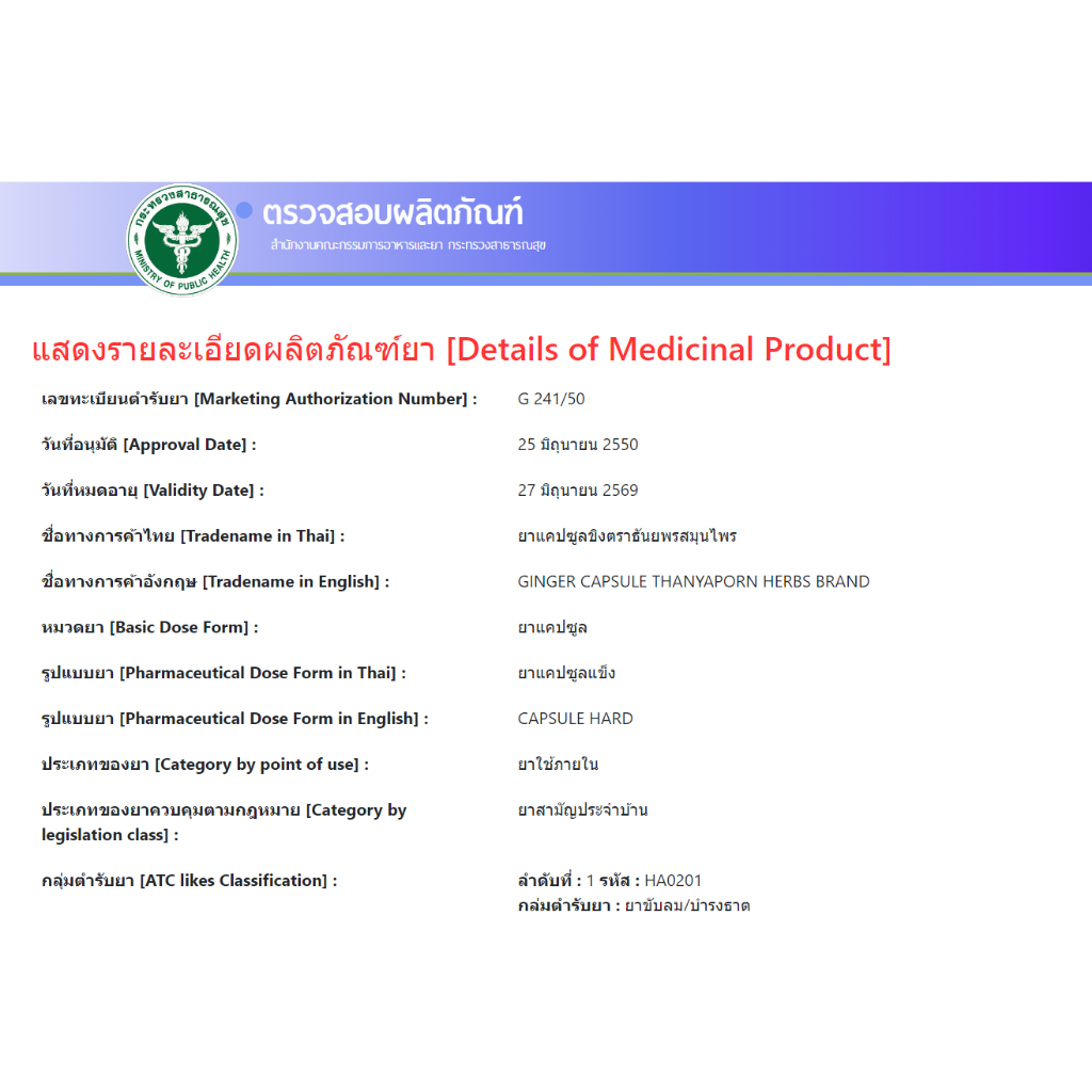 ขิง ธันยพร สมุนไพร 100 แคปซูล Ginger Thanyaporn 100 capsule