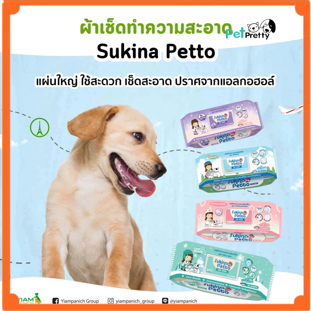 Sukina Pet Wipes ผ้าเปียกสุนัข ผ้าเปียกแมว 70แผ่น 4 สูตร( สุกินะ ทิชชู่เปียก เช็ดตัว สัตว์เลี้ยง แผ่นเปียกสัตว์เลี้ยง )