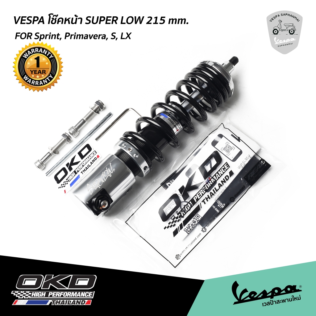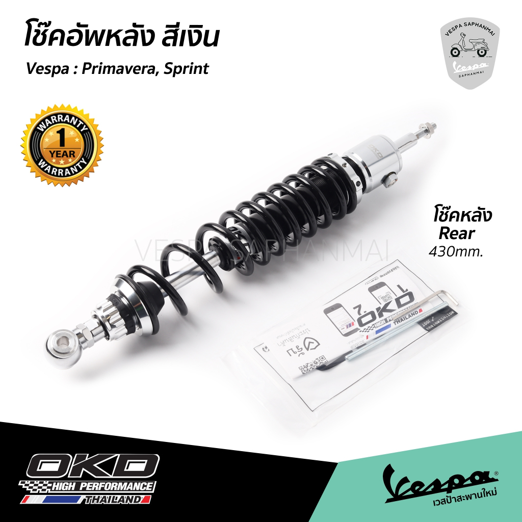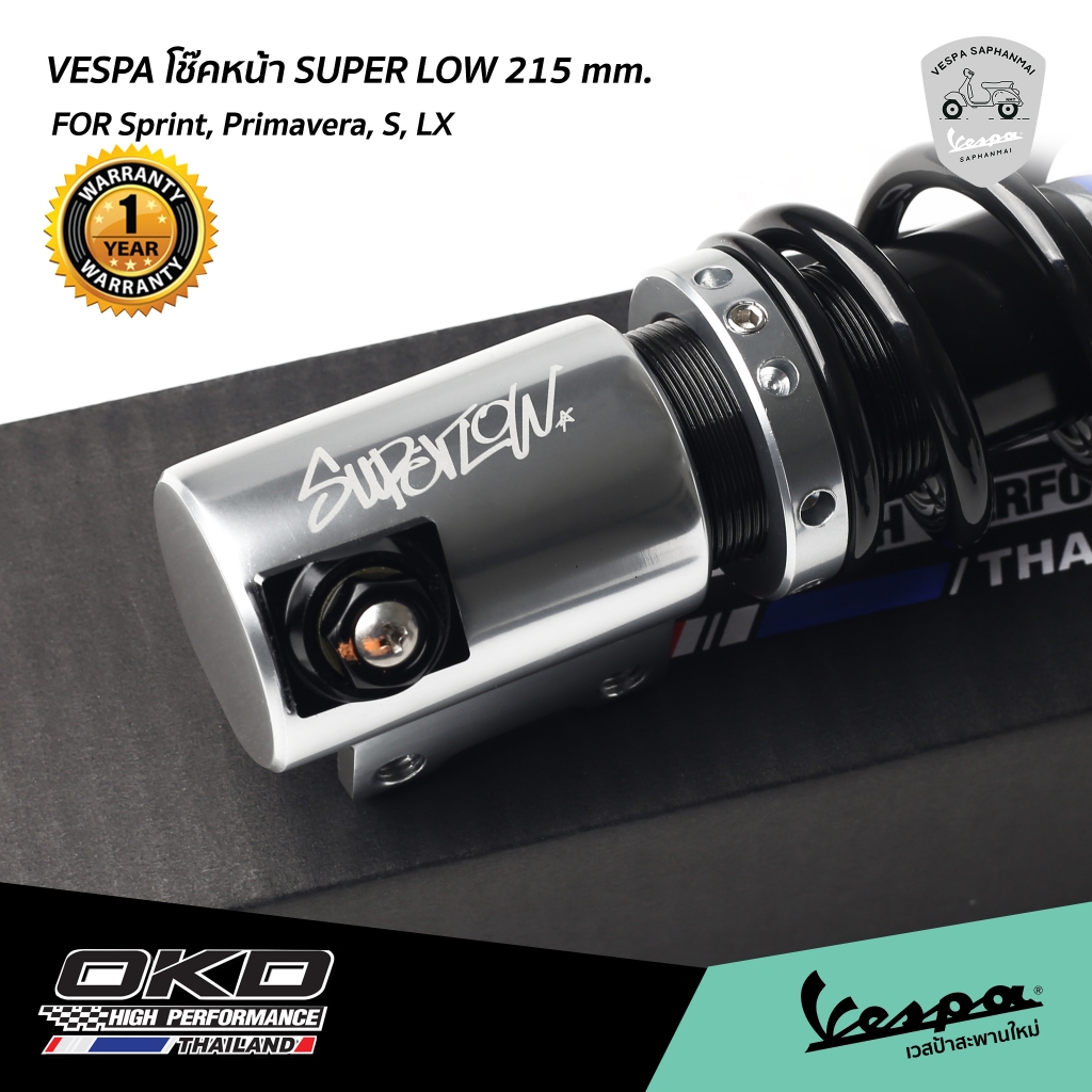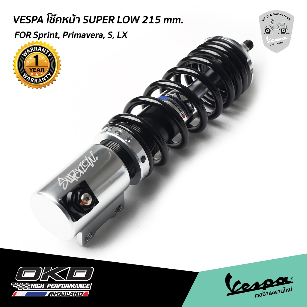 โช๊ค OKD Super Low เวสป้า Sprint, Primavera หน้า 215 mm. / หลัง 430 mm. สีเงิน รับประกัน 1 ปี จาก OKD Thailand