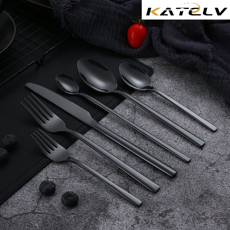 ช้อนส้อม มีด สเตนเลส สีดํา ช้อนส้อม ช้อนส้อม ด้ามสี่เหลี่ยม บนโต๊ะอาหาร กาแฟ น้ําแข็ง ส้อมขนมหวาน ขัดเงา อาหารเย็น 1 ชิ้น
